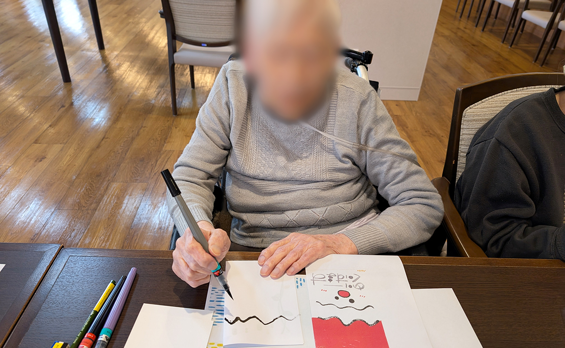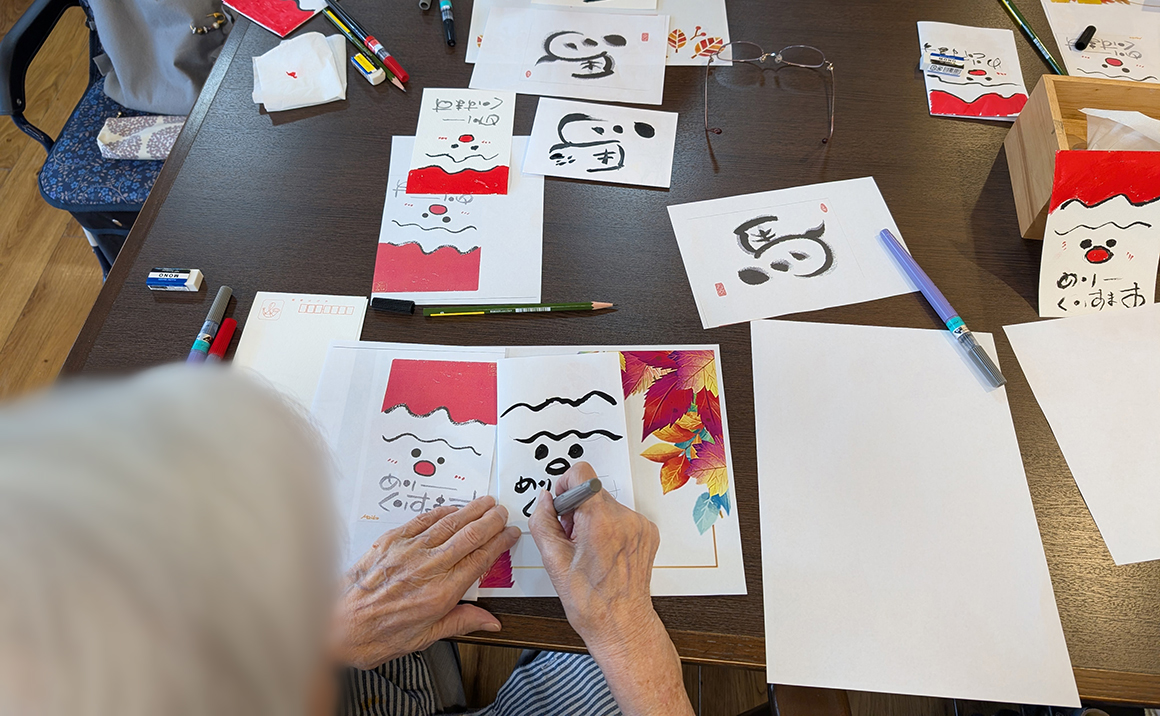 筆文字アート第2弾を開催致しました。 本日はクリスマスに向けてサンタクロースの絵と来年の干支、馬をハガキに描いていただきました。