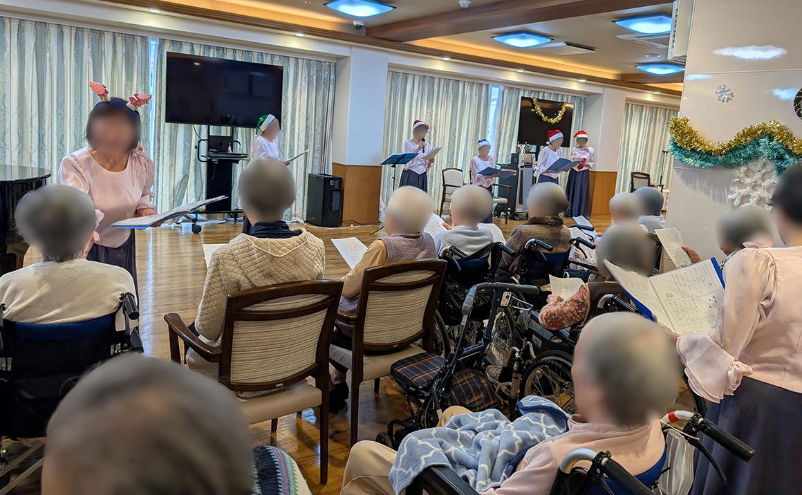 歌詞カードもご用意いただき、しあわせなら手をたたこう、あの素晴らしい愛をもう一度やジングルベルなど皆で楽しく歌わせていただきました。