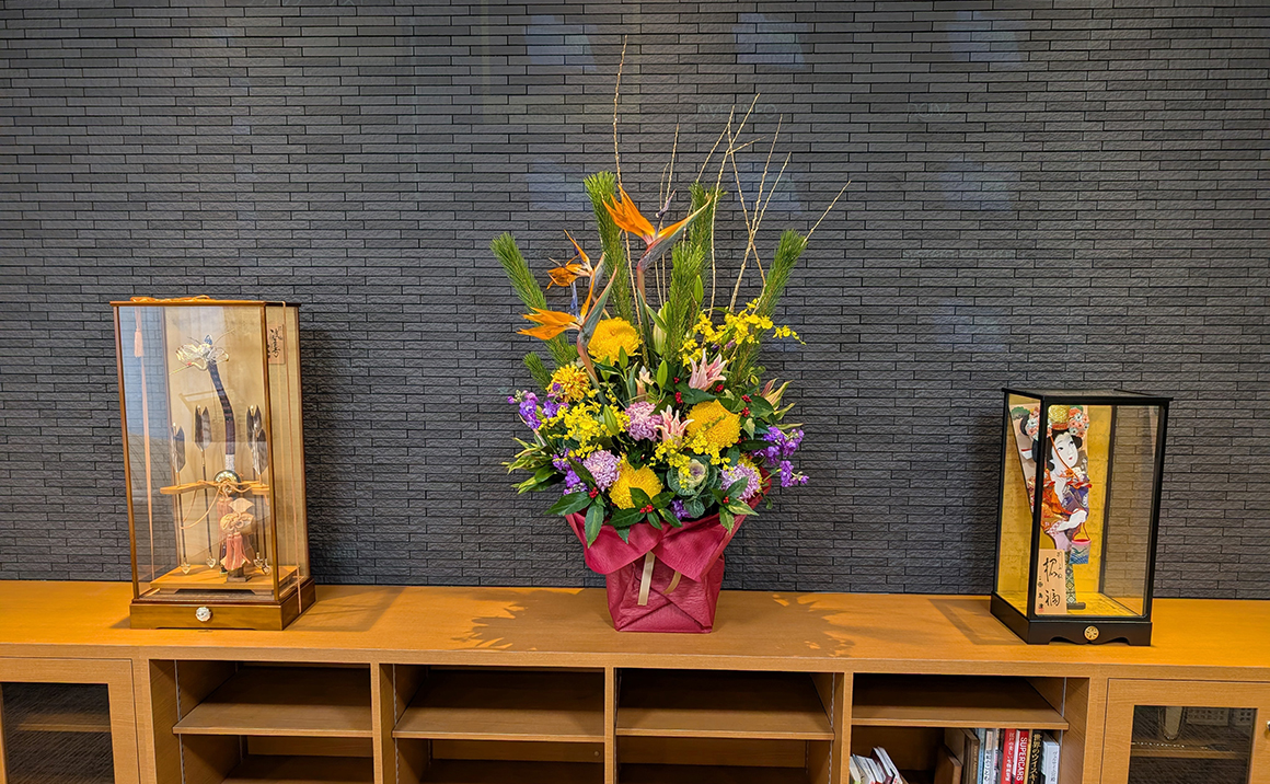 門松を見ると新しい年を迎えたことを実感します。 正月花も鶴が飛び立つようなお花、極楽鳥花が本当にお正月らしく、ご入居者様からも感嘆のお声をいただきました。