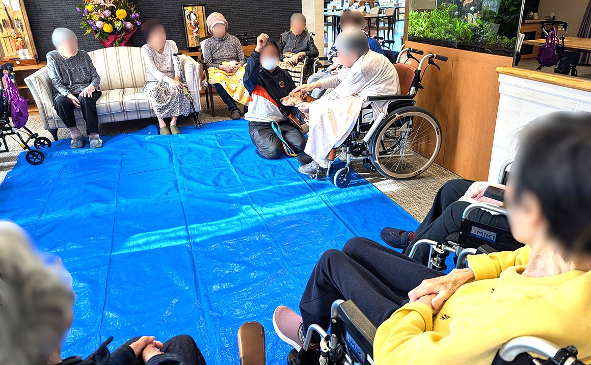ご入居者様に撫でられてうっとりした顔に皆様癒されておられました。 「おとなしいね~」「かわいいね~」と嬉しそうに会話もはずんでおられました。