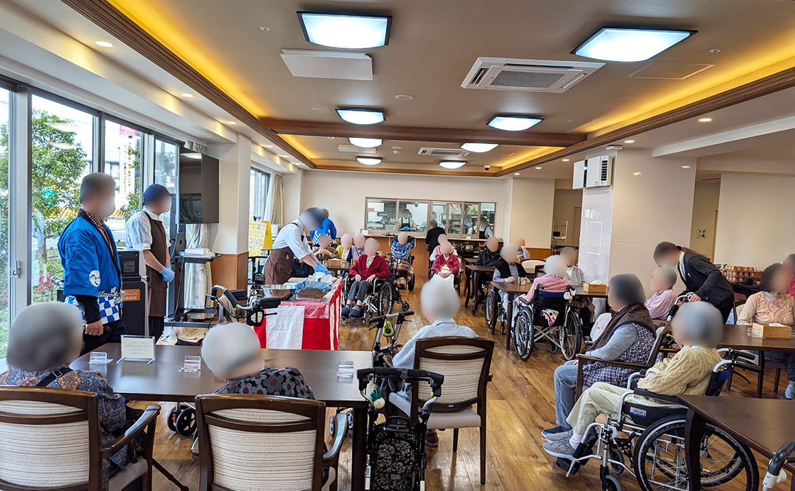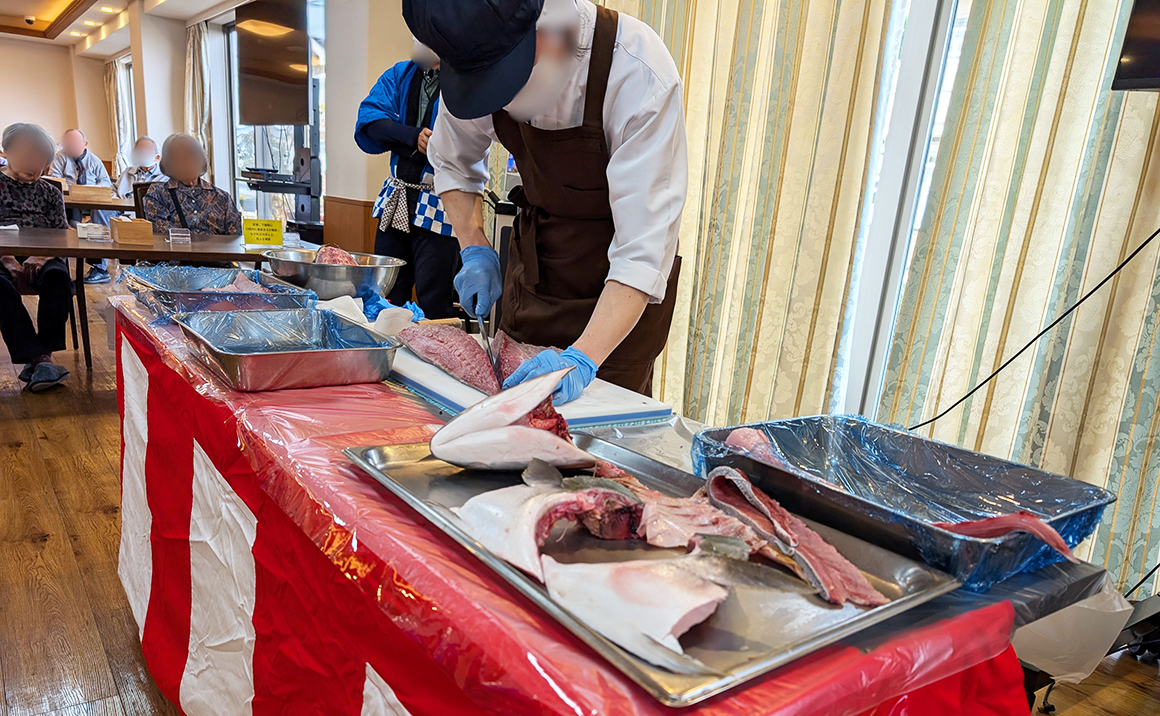 ご入居者様に感謝の気持ちを込めて、ぶりの解体ショーを開催し目の前で見ていただきました。