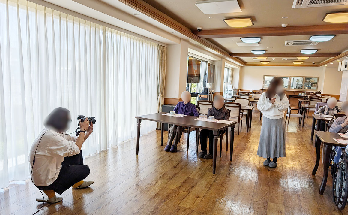 機能訓練やお食事、お部屋、紅茶の会等のシーンを撮影していただきました。 撮影にご協力していただいたご入居者様、編集者の方々、ありがとうございました。