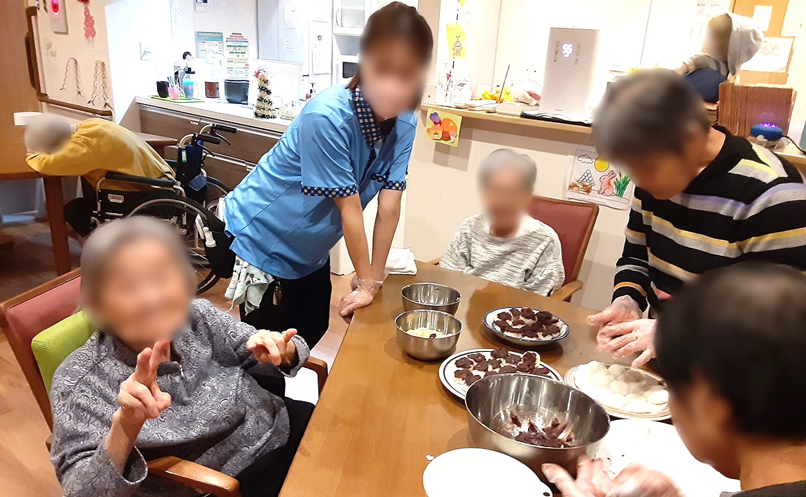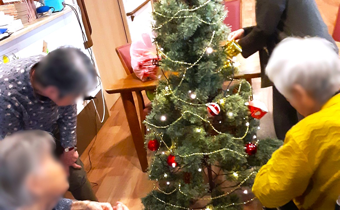今月はクリスマスということで皆さんでクリスマスツリーの飾りつけを行いました。 皆さん真剣に飾りつけに取り組まれており、完成した際には「綺麗ね~。」と笑顔も見られています。 別の日には隣の保育園からお声掛けいただき、お餅つきにも参加させていただきました。 久しぶりに触れるお餅の感触を楽しまれていました。 同日のおやつは皆さんでおはぎ作りを行い、談笑を楽しまれました。