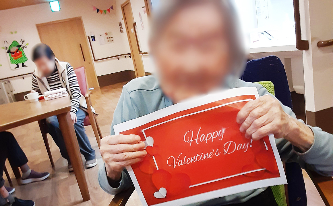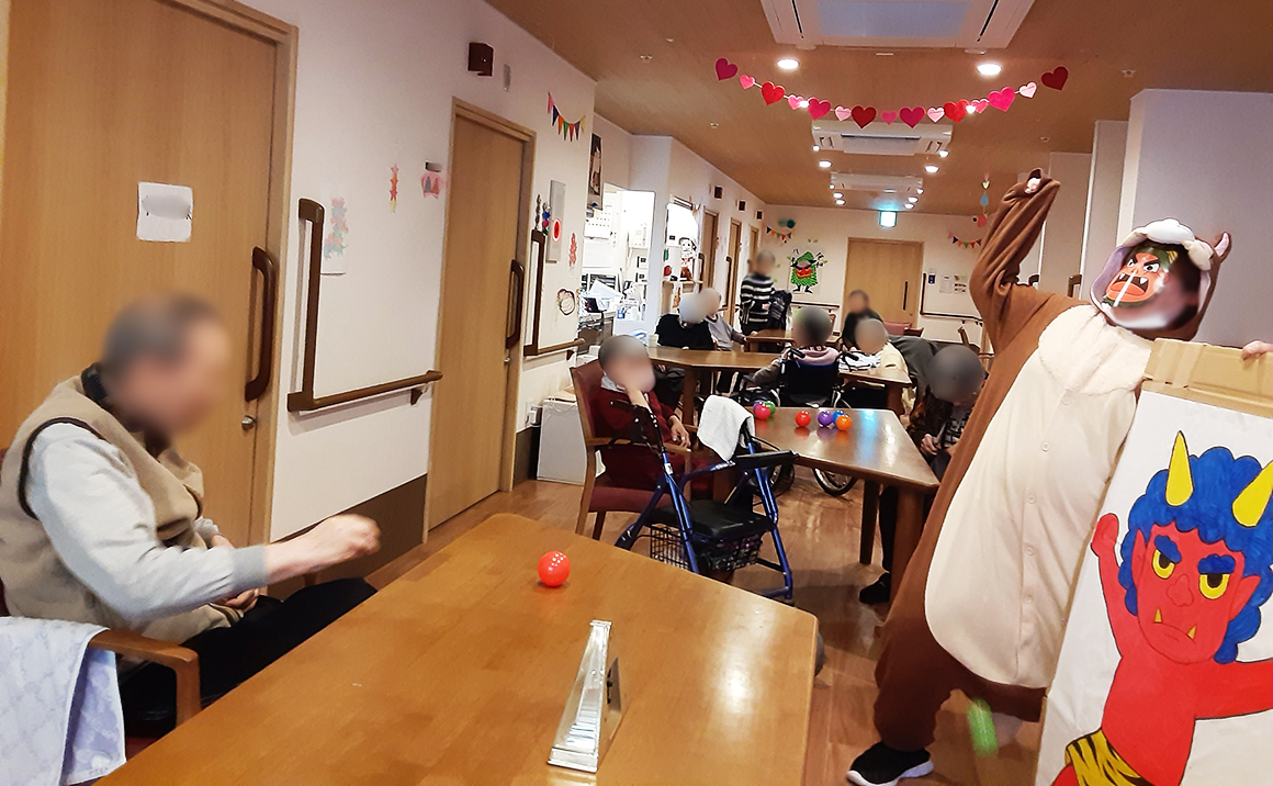 2月3日に節分イベントを行いました。 鬼に扮した職員へ豆の代わりにカラーボールを投げていただき 節分の雰囲気を感じていただきました。 14日にはバレンタインデーイベントとしてケーキ等のおやつを 提供させていただき、普段と違った甘味を楽しんでいただきました。
