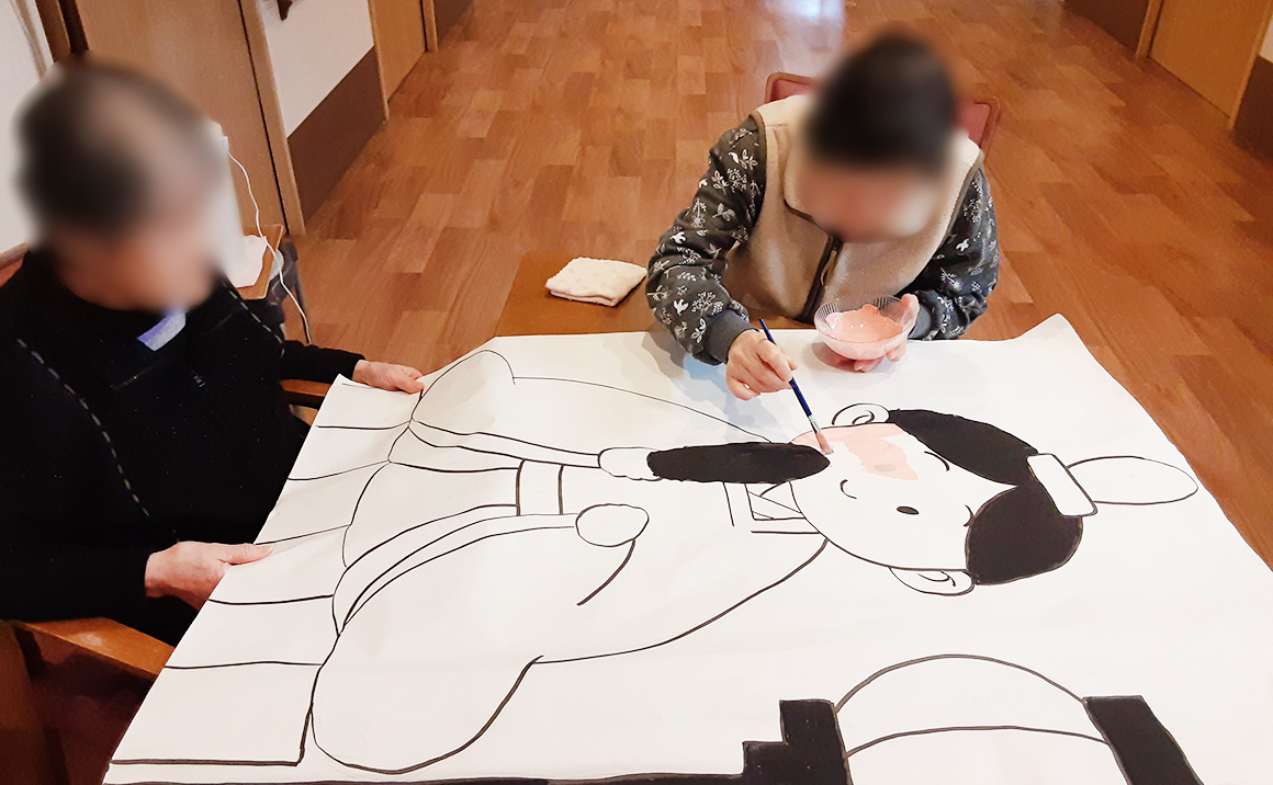 日常レクリエーションでは来月のひな祭りに向けて 皆さんで壁絵の作成に取り組んでいただいております。