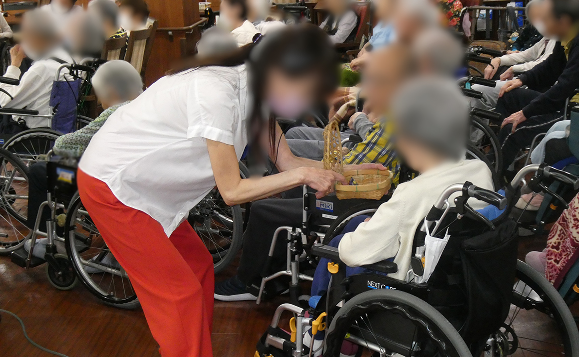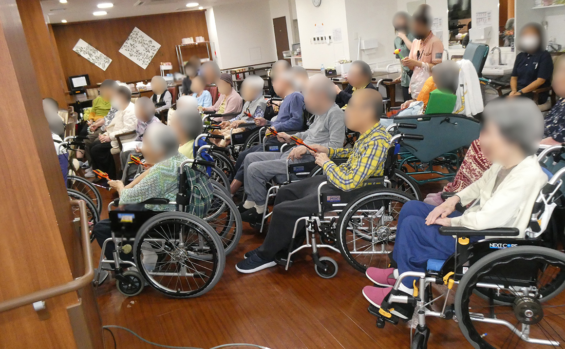 今日は音楽リハビリの日でした。 職員が赤とんぼになって皆さまの周りを飛んだり 懐かしい「ズンドコ節」や「赤とんぼ」「ふるさと」など 歌ったり楽器でリズム運動を楽しみました♪