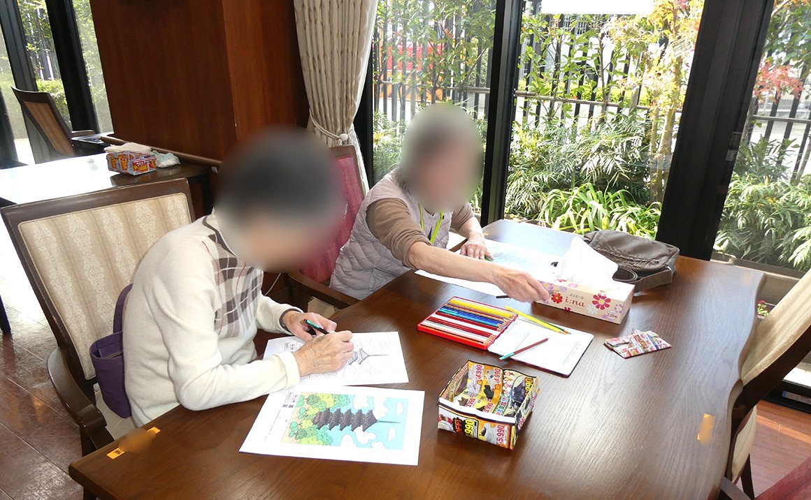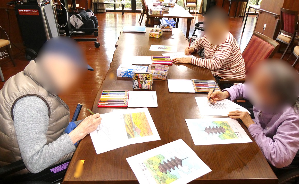 ぬり絵教室のご様子です 皆さま風景の絵に、思い思いの色を重ねて おやつの時間を忘れるくらい集中されていました(^^;