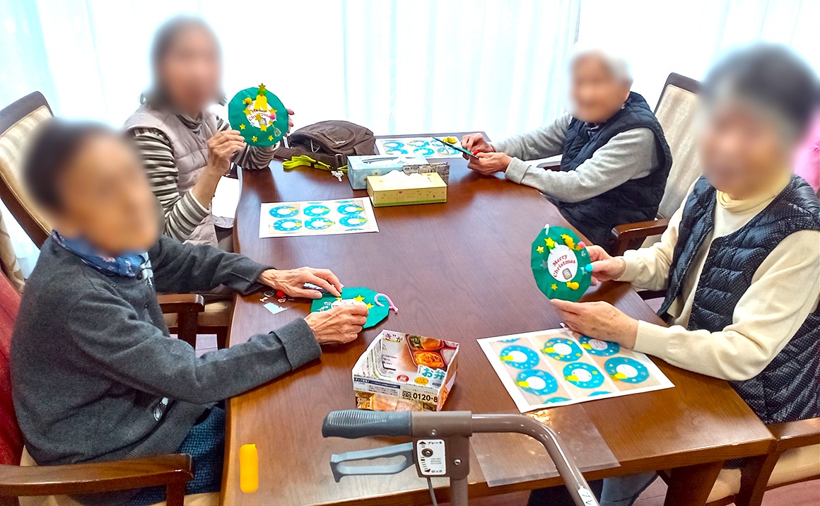 本日はクリスマスのリース作りを行いました。 皆さまリボンや星やベルを思い思いの場所に飾りつけ 個性豊かなリースが完成しました🎄