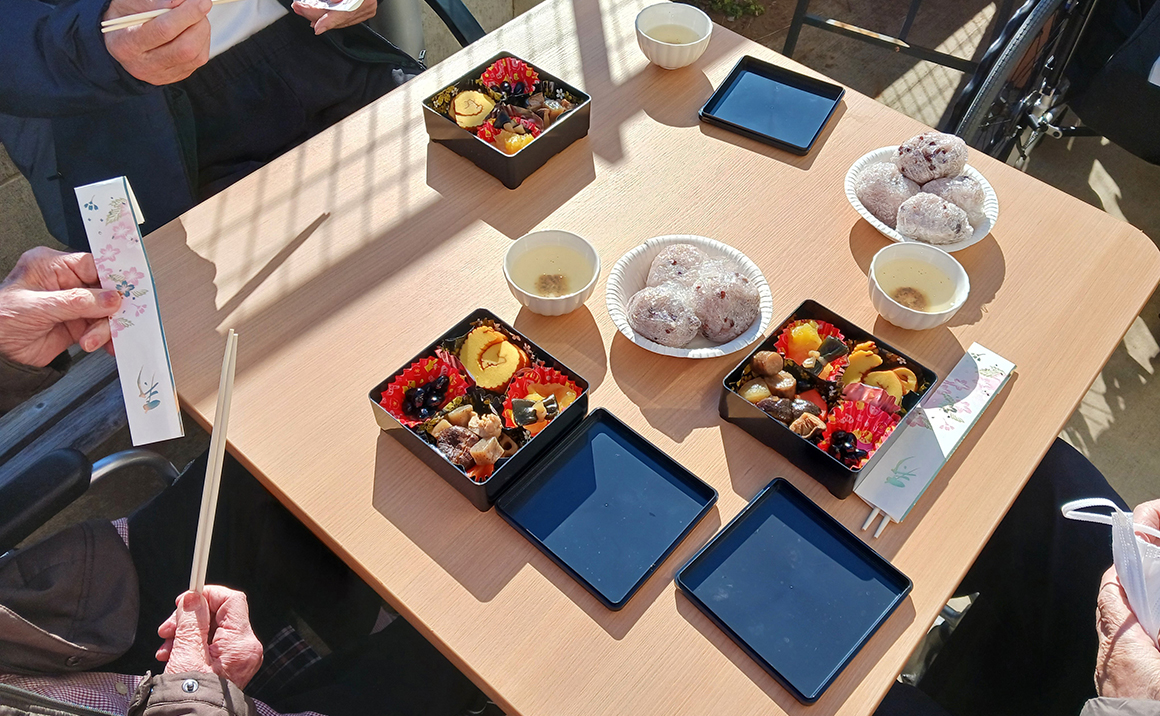 今年の年始は暖かいですね。 そこで、お正月のお節料理を外で楽しんでいただきました。 この季節、外で食事ができる機会はなかなかないので、日本晴れに感謝です!