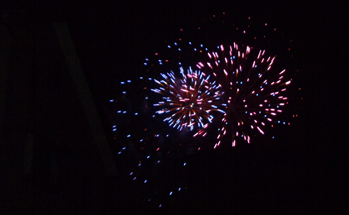 その日出勤していた夜勤者が外から何か爆発音が聞こえるのに気付き、窓を開けると大きな花火が夜空に打ち上がっていたのを