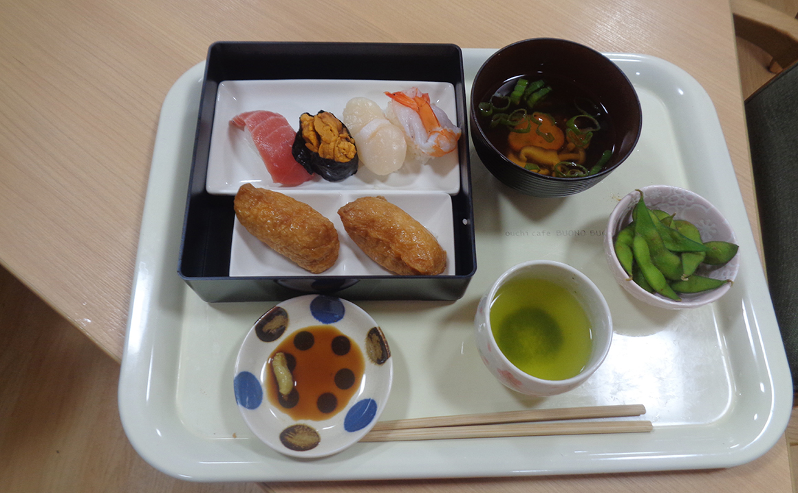 この日の日中は普段通りゆっくりと過ごし夕食のメニューはお寿司とお稲荷さんと枝豆にお吸い物! 皆さん、すごいねえ!と、とても驚かれていました