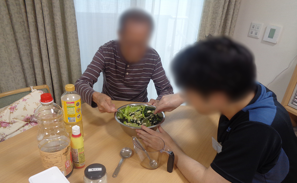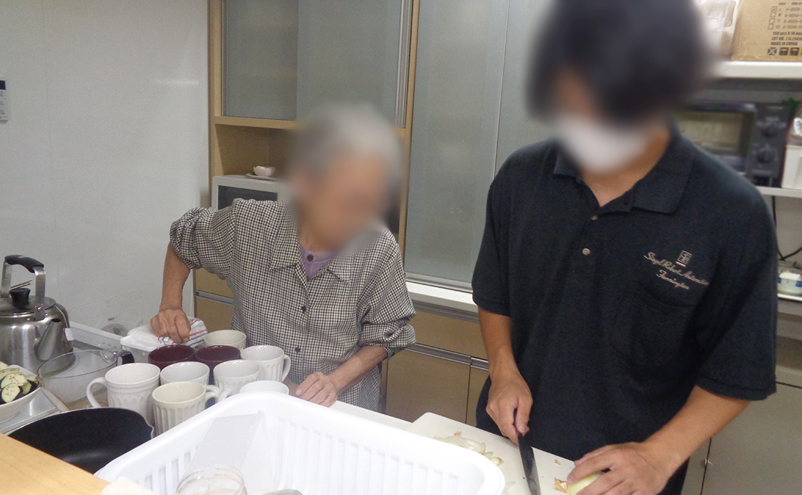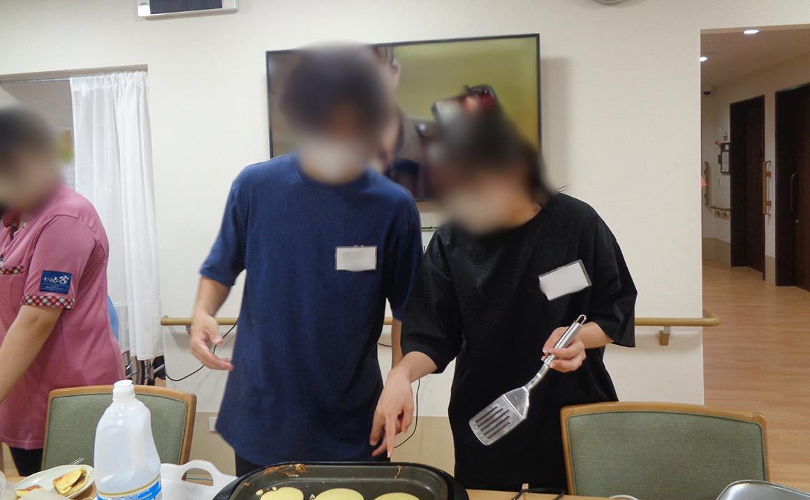 今回は、”調理での様子”となります。 学生さんは20才前後の若者‼包丁を持つ手に、入居者様もハラハラで見守っています。