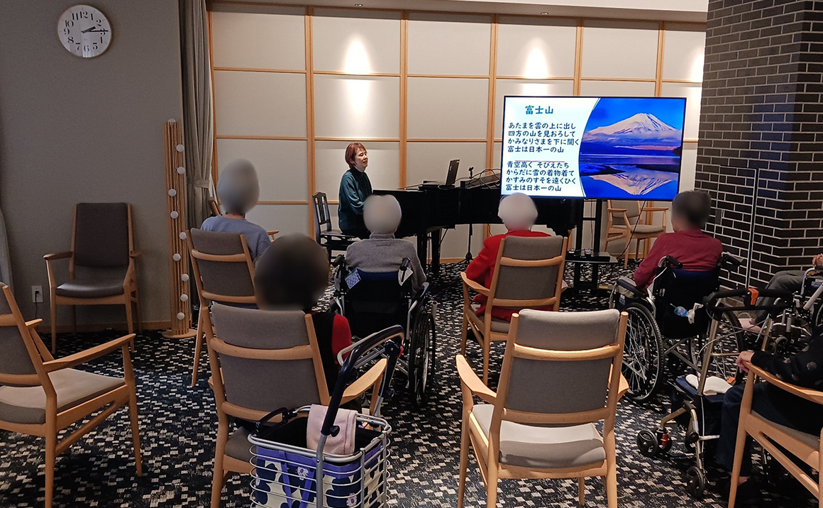ご入居者様は音楽療法で大きな声で歌って下さり賑やかな時間を楽しく過ごしていただいております。
