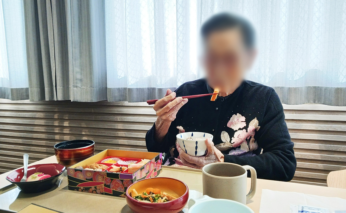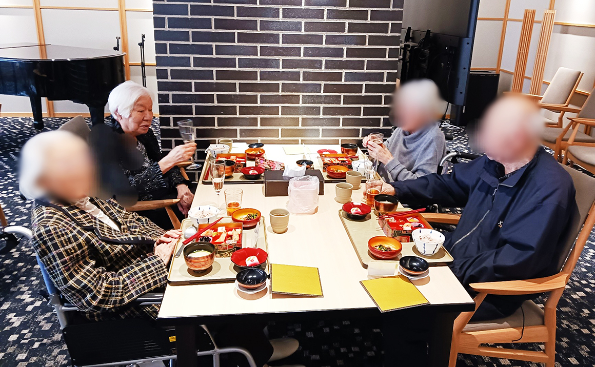 『彩り3種盛り』は豪華で美味しく、『お雑煮』は白みそ仕立てでとても美味しいとご入居者様達から大変好評でした。 お飲み物は「澪」を準備し皆様非常に喜ばれて「美味しい」「おかわりちょうだい」と仰りおせち料理、お赤飯と合わせて「豪華で美味しい」「見た目も奇麗で食べるのがもったいない」と笑顔がたえませんでした。