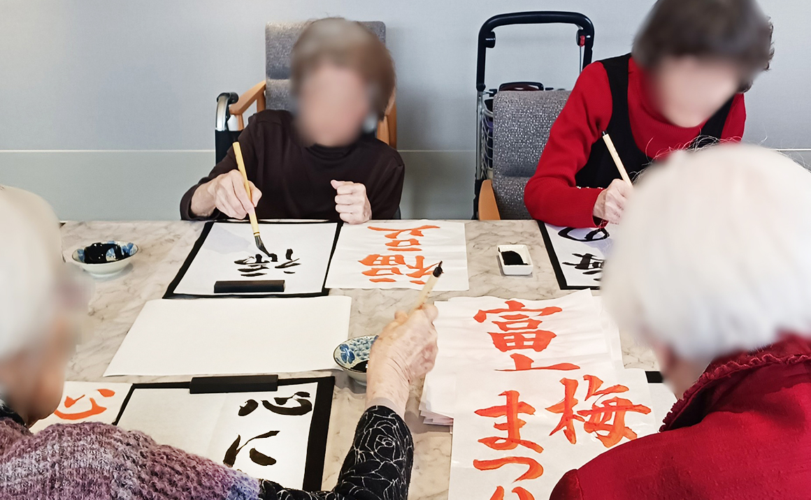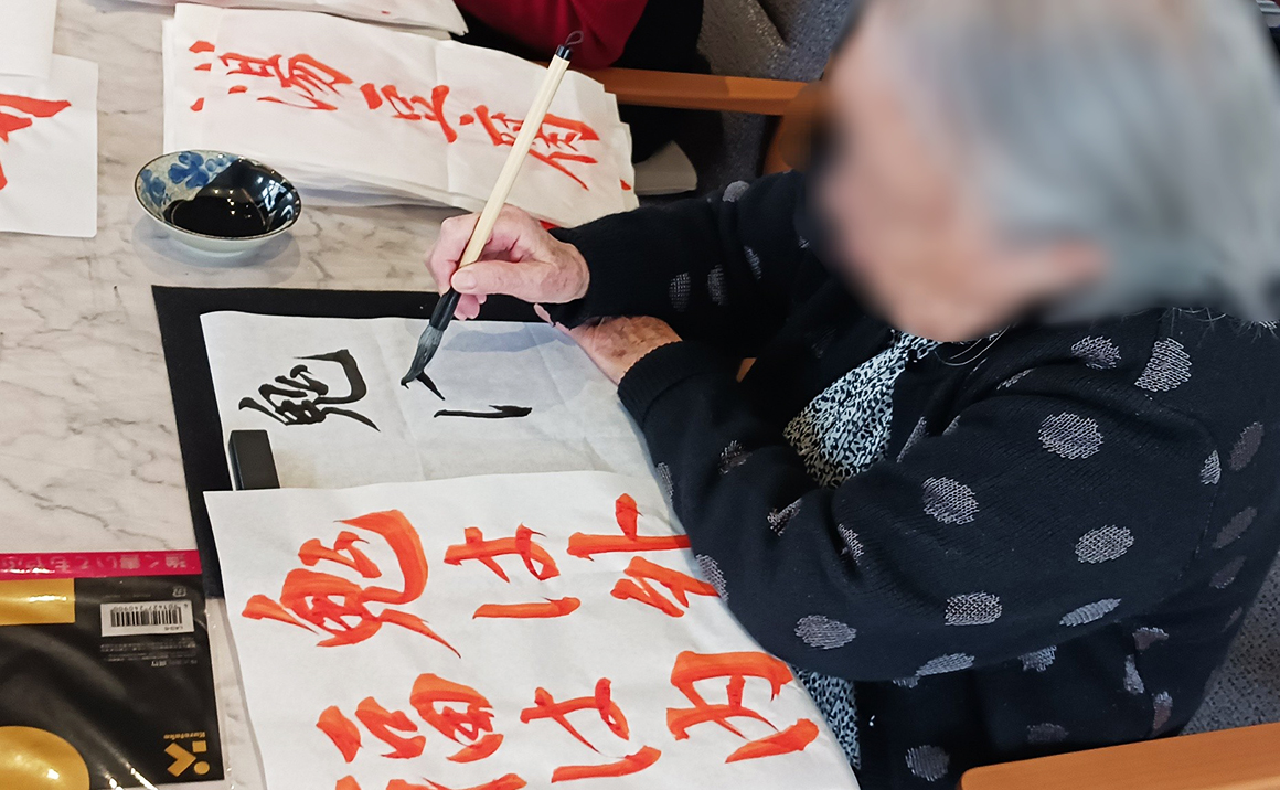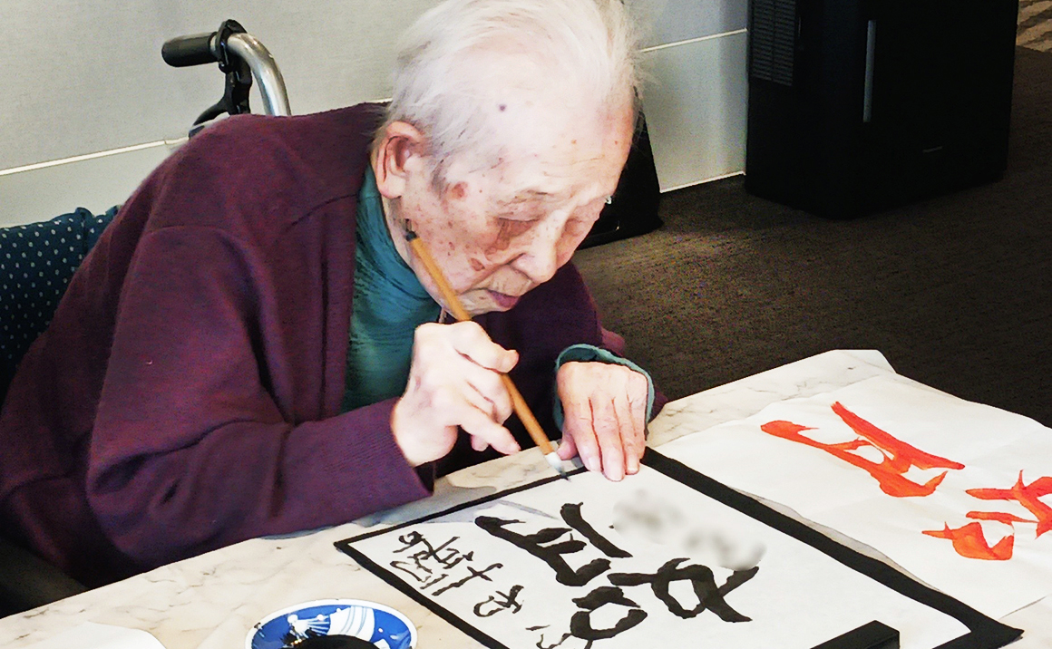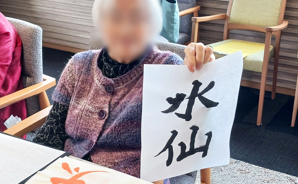 本日の書道の日も、皆様準備が出来次第黙々と熱心に何枚も書かれておられました。 職員に「これは奇麗にかけたでしょ?」「こっちより、これの方がいいかしら?」などお聞きになり時間いっぱいまで楽しまれておられました。