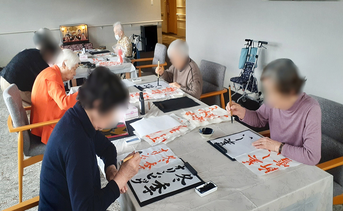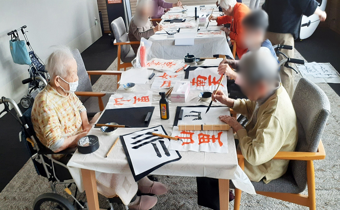 本日の書道の日も、皆様に見本を選んでもらい「これを書きます」「どの見本がいいですか?」など仰り皆様楽しみにされておられました。 何枚も黙々と書かれたりお話されながら書かれたり楽しまれておられました。