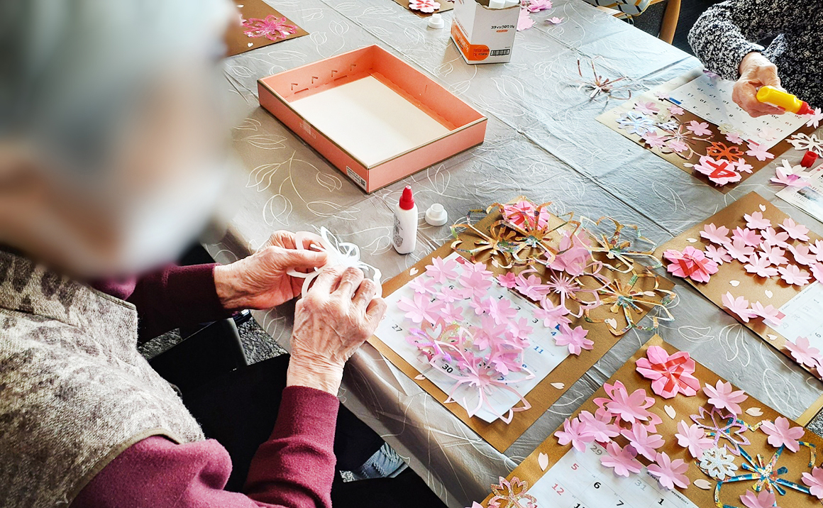 4月のカレンダーは折り紙で作った桜の花を、好きなだけ貼っていただきました。 貼り方も様々で、デザインや大きさ違いの花弁を重ねて貼るなど、個性あふれる作品が出来上がりました。 金色地にピンクの桜、花びらがよく映えて、お部屋がひときわ明るく春らしくなったと後入居尾者様だけではなく職員からも好評でした。
