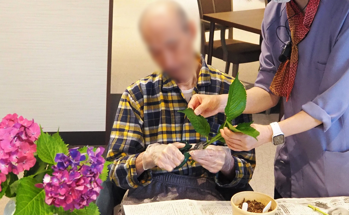 プレザンリュクス南青山には、和風庭園と洋風ガーデンがあります。 今回は和風庭園に咲いた立派な紫陽花の挿し木を行っていただきました。 男性の方たちも力強く枝を切ってくださったので、来年はさらにたくさんの紫陽花が楽しめそうです。 庭園にもまだまだ紫陽花が咲いております。是非お越しいただきご覧くださいませ。
