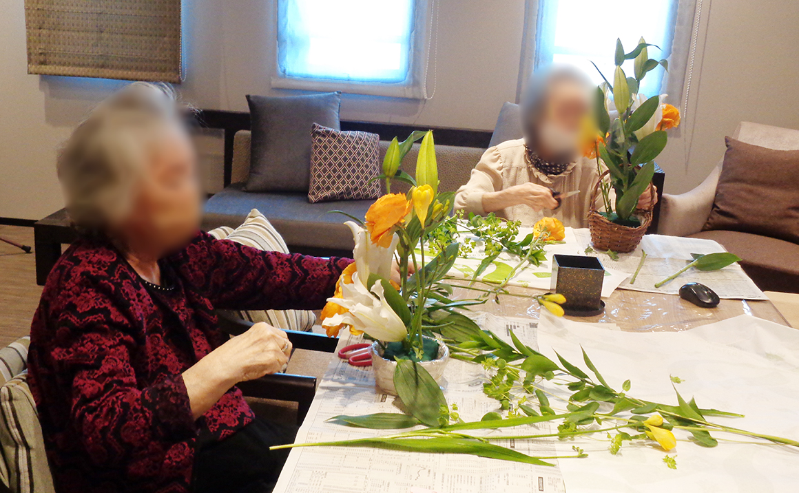 毎月恒例のフラワーアレンジメントでも、春を感じられる明るい花材を使用して 素敵な作品ができています。