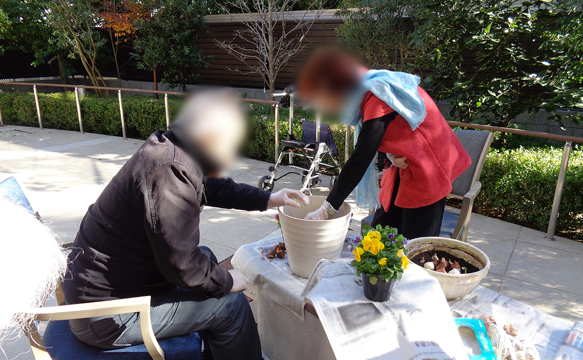 木々の葉が色を失っていく冬の時期、チューリップ、ムスカリ、ビオラをご入居者様と一緒に鉢植えてガーデンを彩るとのこと。