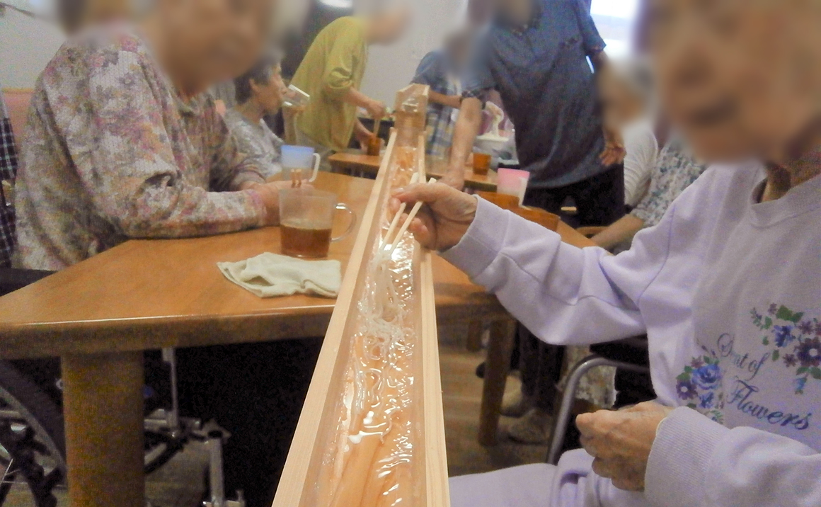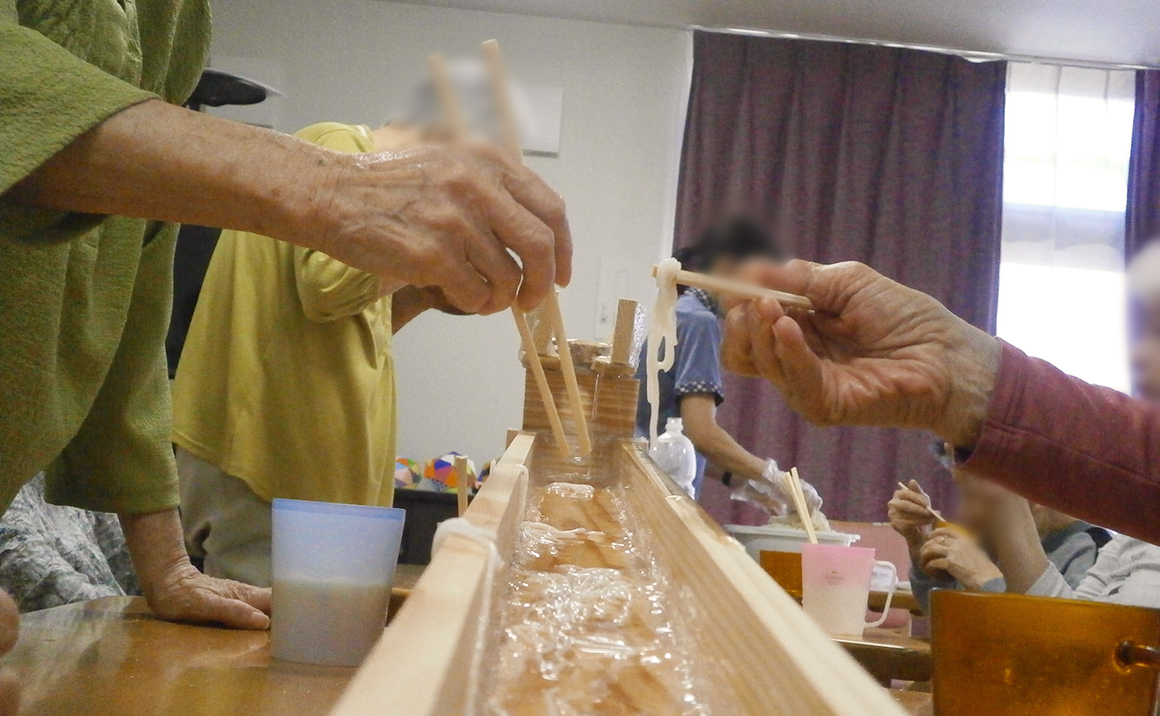 たのしい家伊川谷潤和には、器用な職員が居ます。 そうめんをそのまま召し上がるよりそうめん流しで食べた方がより楽しく美味しく召し上がれると思い、そうめんの樋を作製されました。 先月は、諸事情でそうめん流しの行事が出来ませんでした。 せっかく作製したので今月やることにしました。 入居者様は、立って熱心にそうめんを掴んで美味しそうに召し上がってました。 良かったわーと終わってからお言葉を頂きました。準備大変やったやろとお気遣いのお言葉も頂きました。 職員は、その言葉で救われまた頑張ろうと思います。