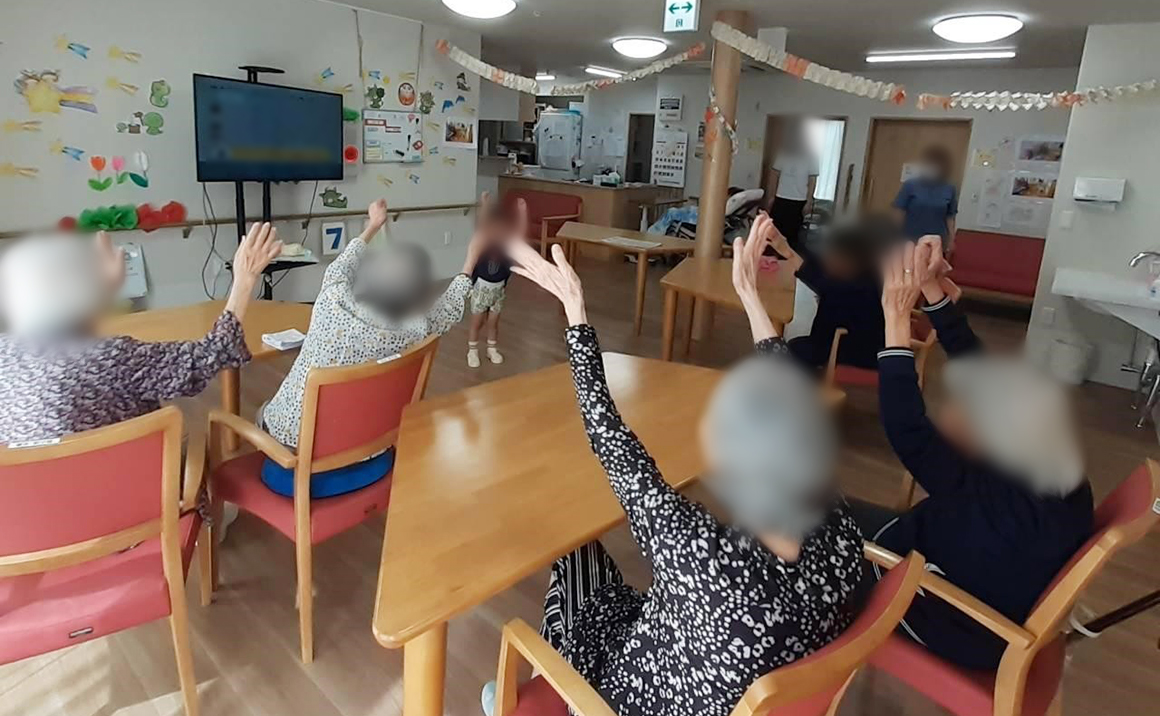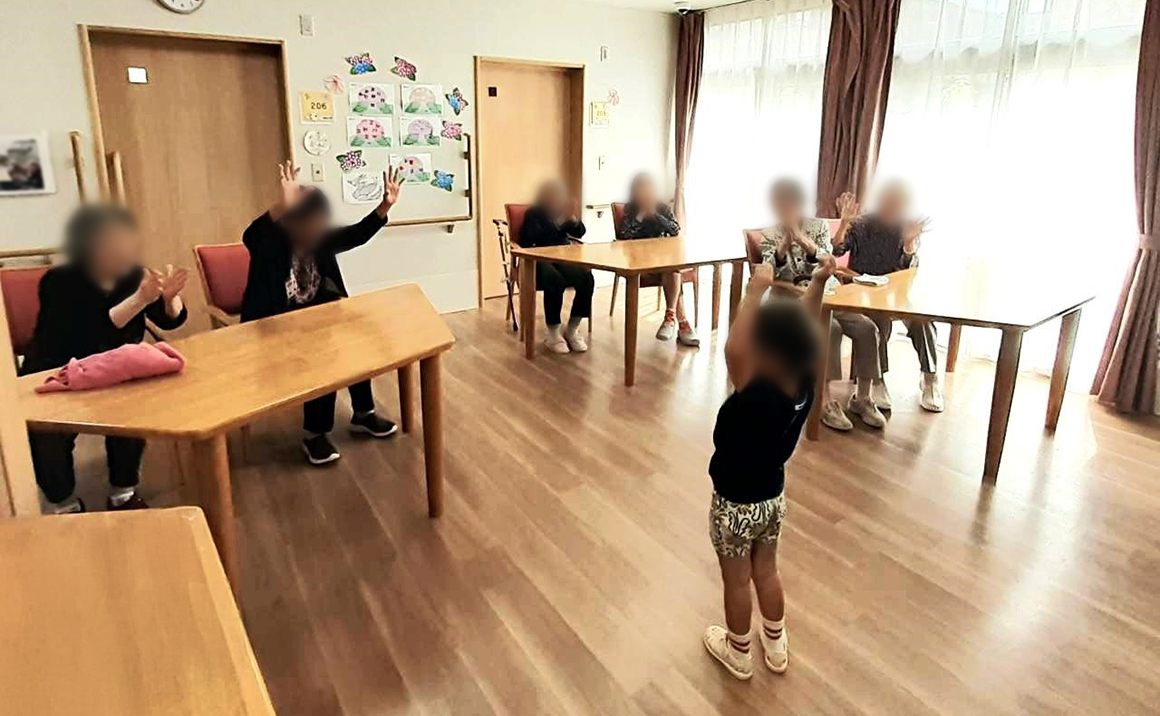 「ガオー!」とライオンの真似をするお子さんにご入居者様も一緒に真似をして