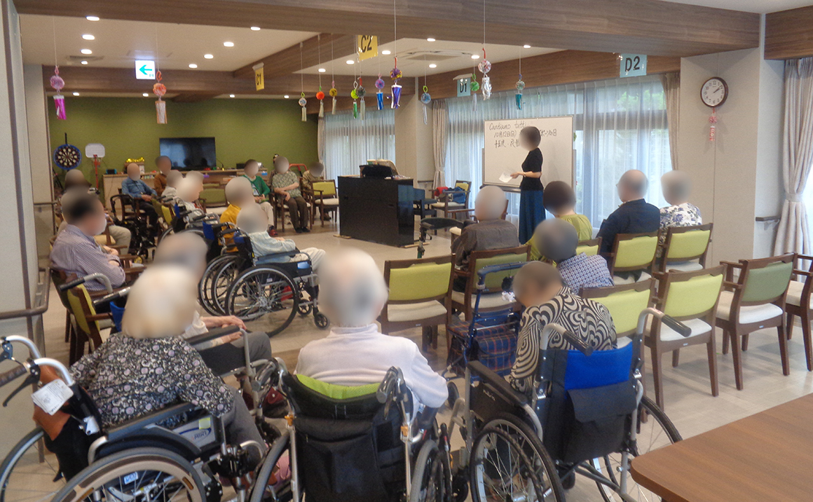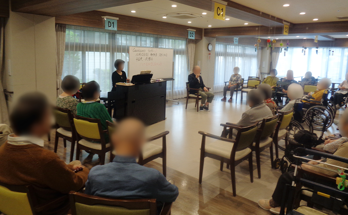 ご入居者さまの1人1人の声が知っている曲に合わせて歌われていて、歌の力は