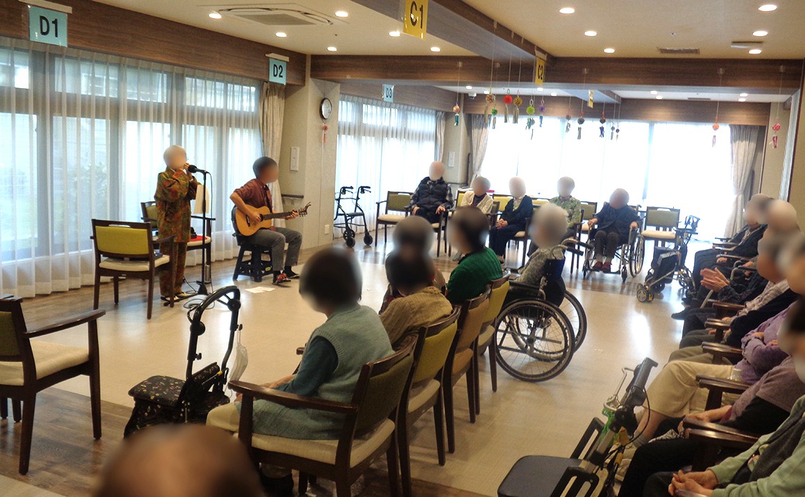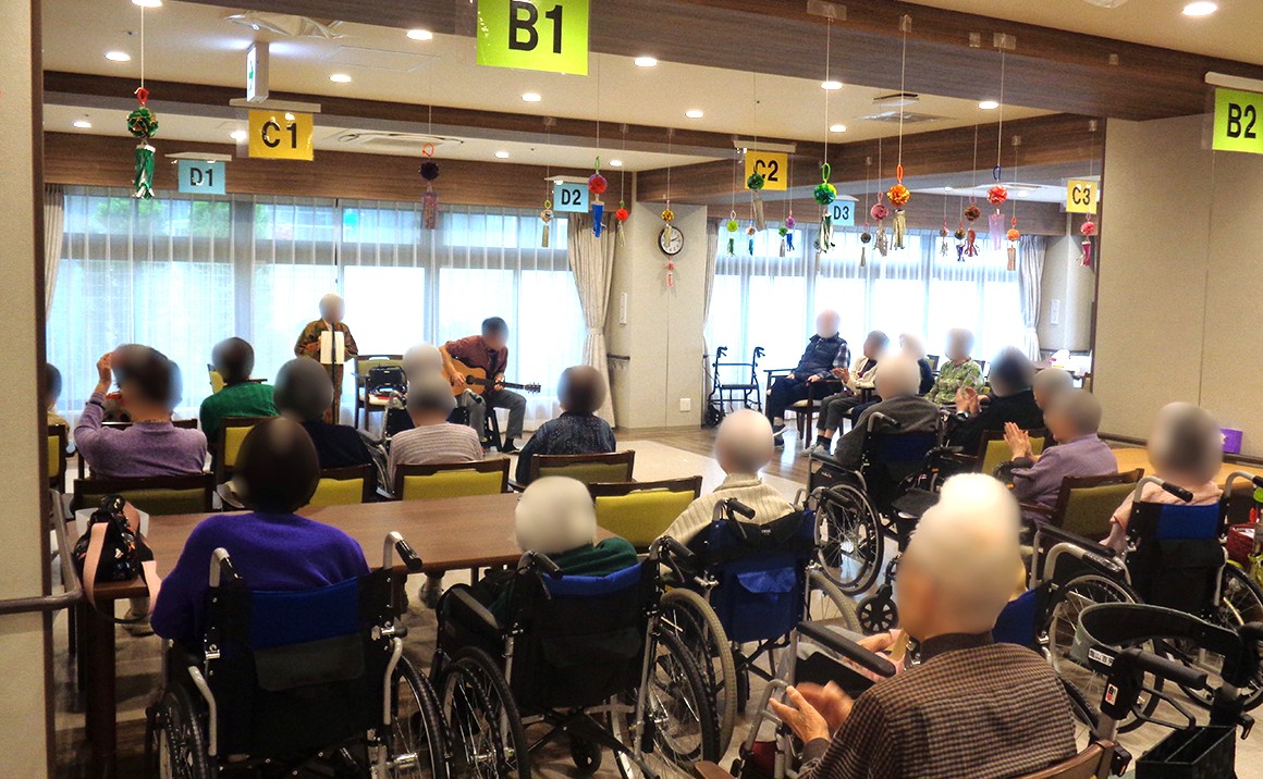 童謡から浦島太郎、桃太郎を演奏し、ご入居者様が1人が歌いだすと、2人、3人と歌いだされ