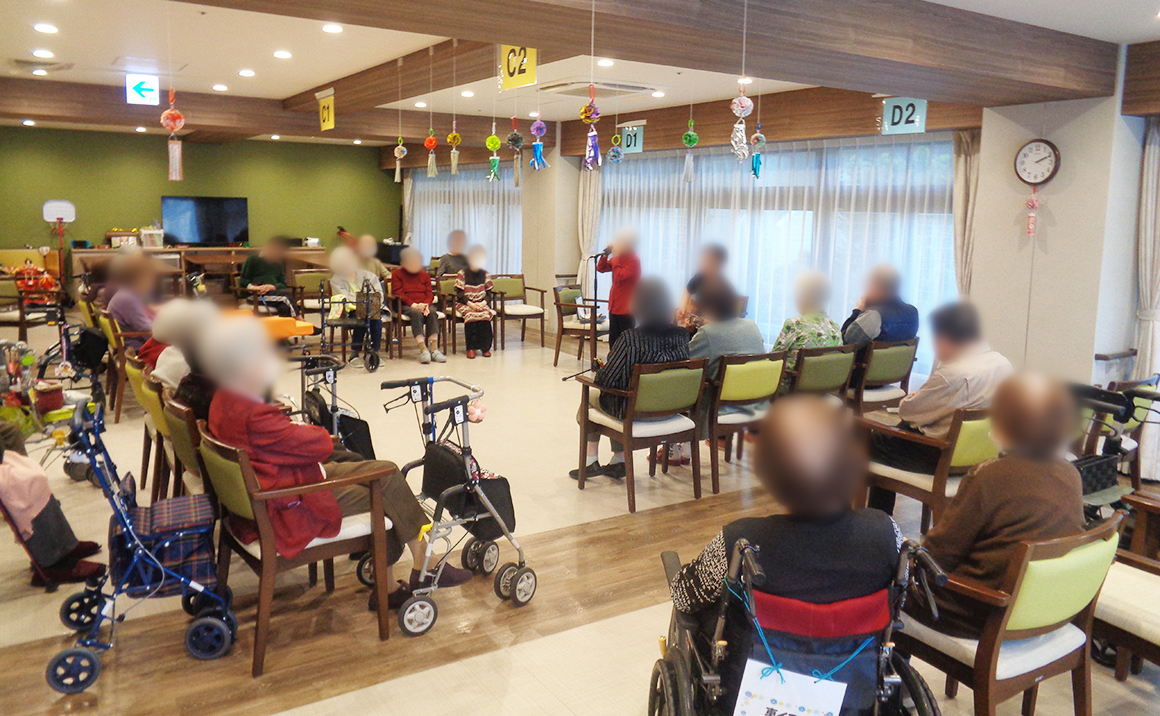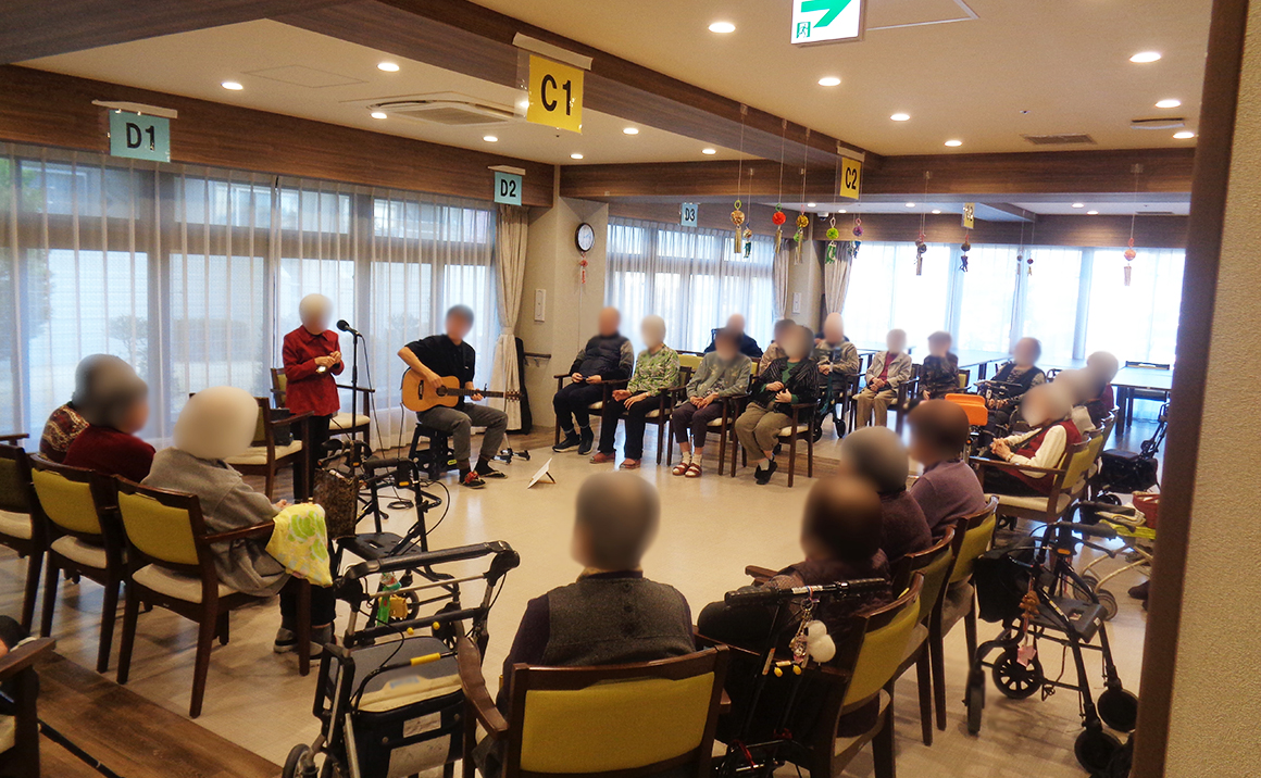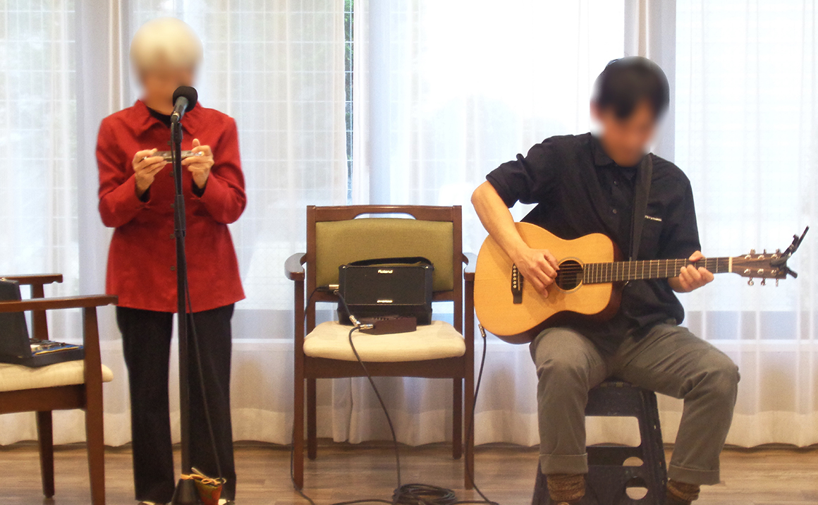ギターとハーモニカの演奏にあわせ、懐メロや童謡をご入居様も一緒に歌っておられました。