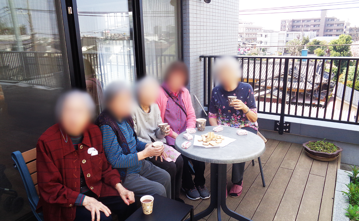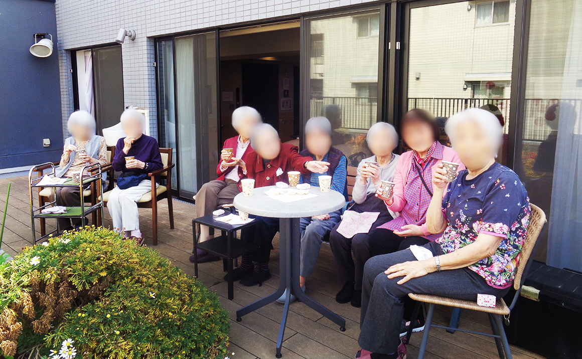 今日は、天気が良かったので、4階のベランダでお茶会をしました。