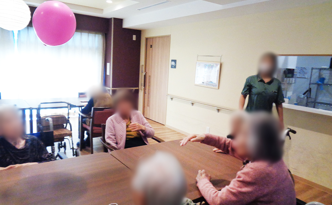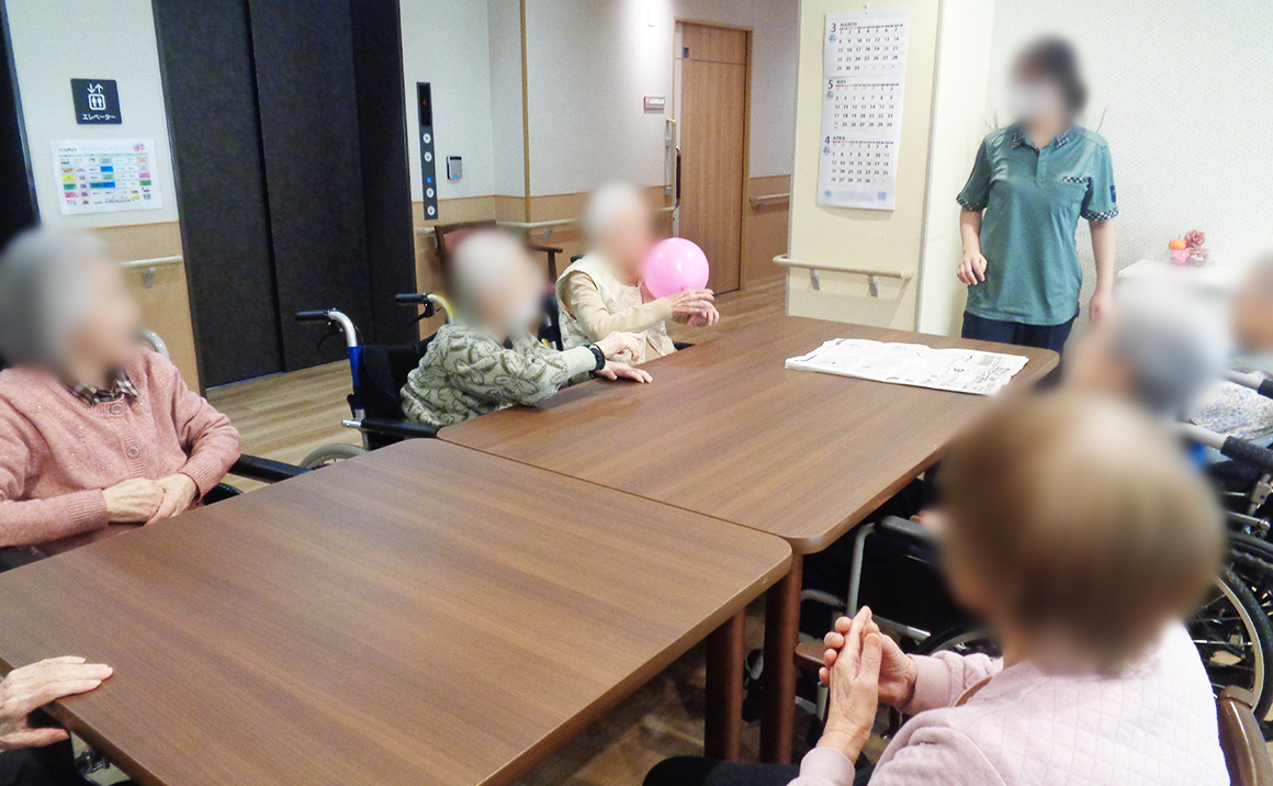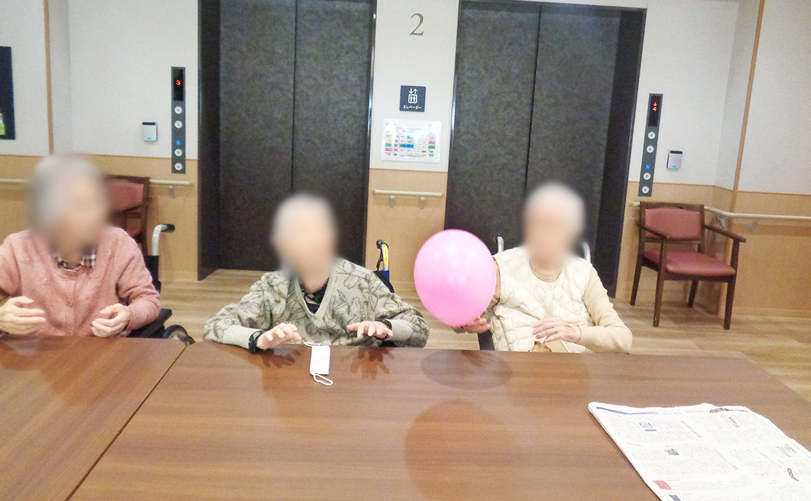 今日は、2階の談話室で風船バレーをテーブルに輪になってやりました。