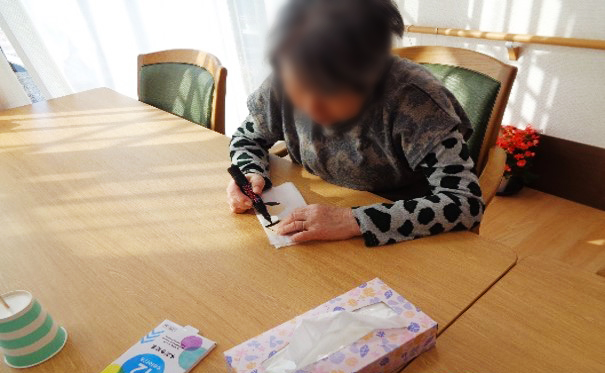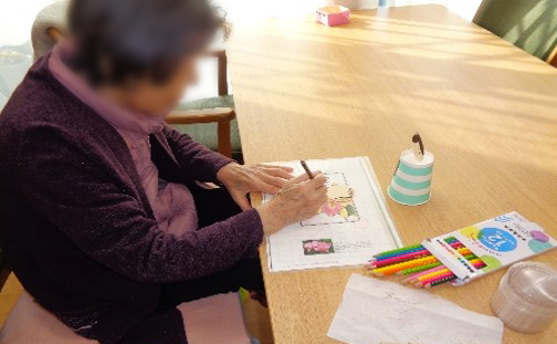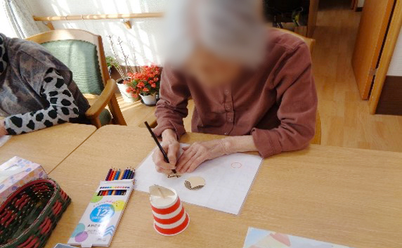 職員が下書きしたひな人形の絵に、ご利用者様たちが色鉛筆を使って色塗りし、ハサミでチョッキン✂