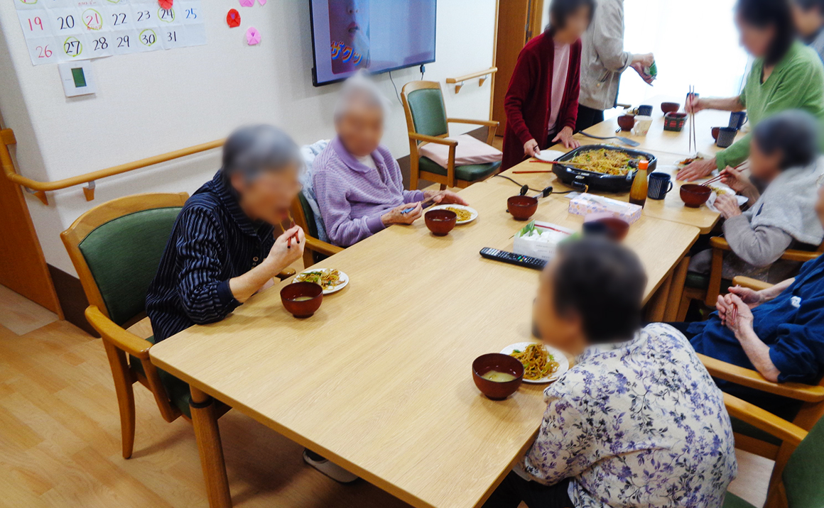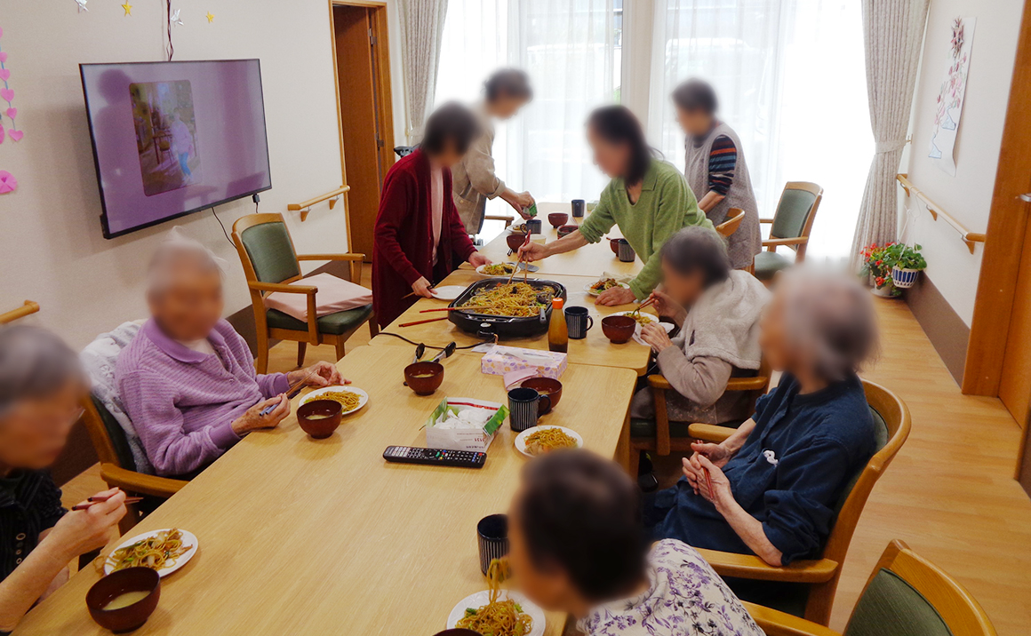 たのしい家戸田 ご利用者様が9人揃ったことで、本日は全員で鉄板にて焼きそばを作りました。