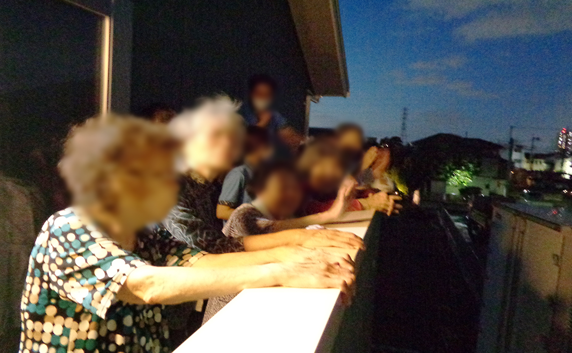 1階のご利用者様も2階に上がってこられ、ベランダにて観賞~