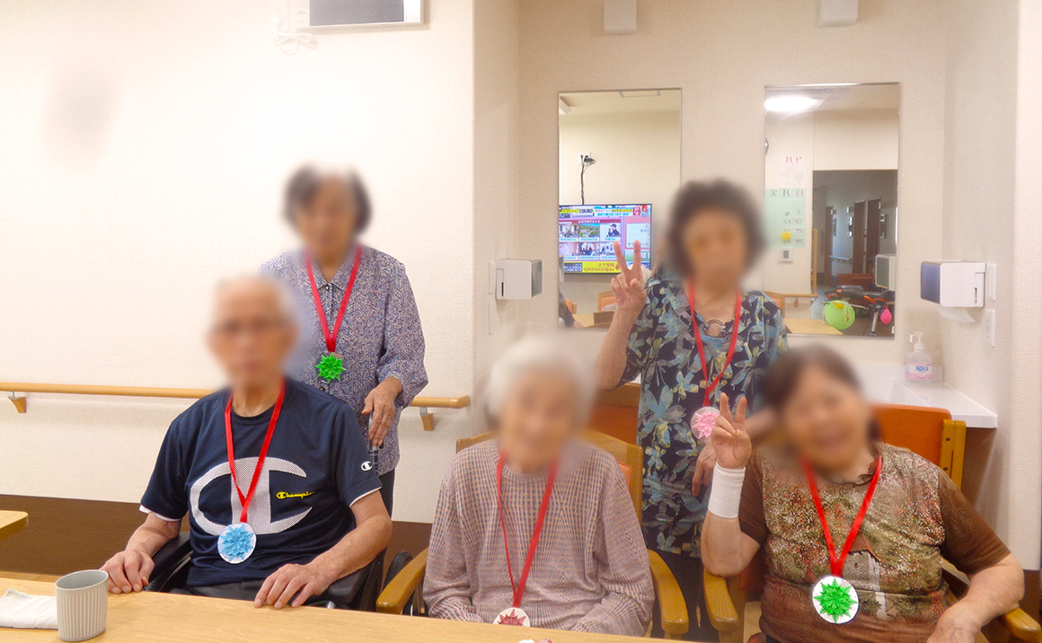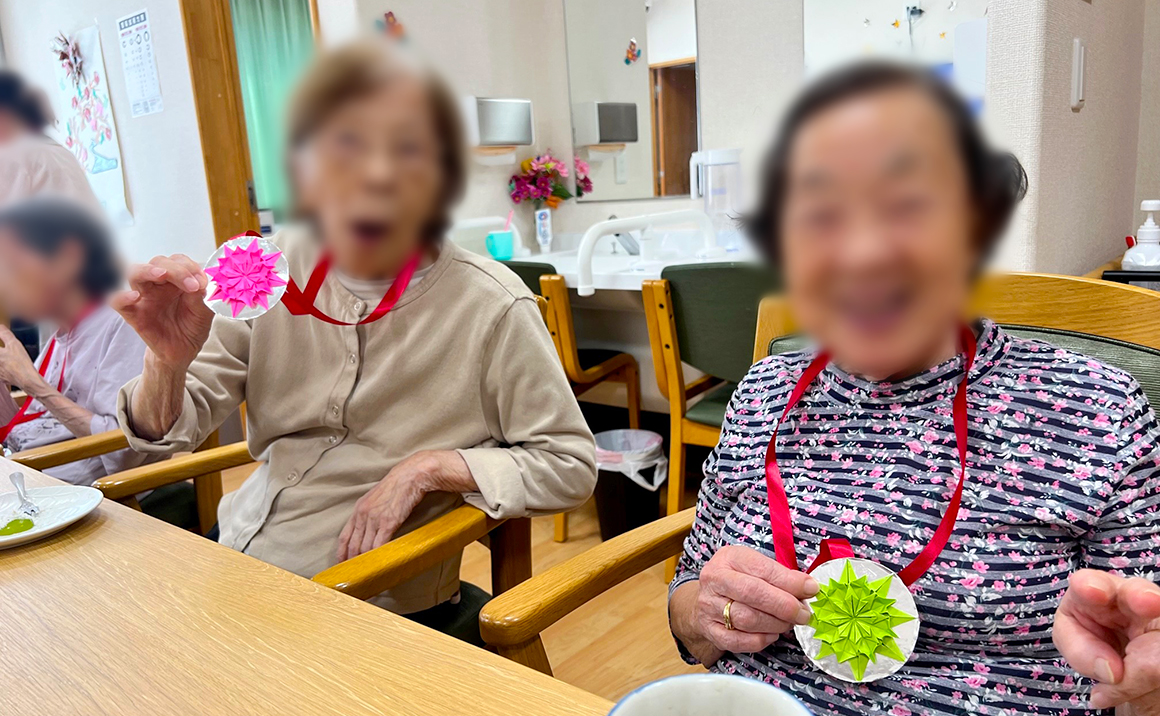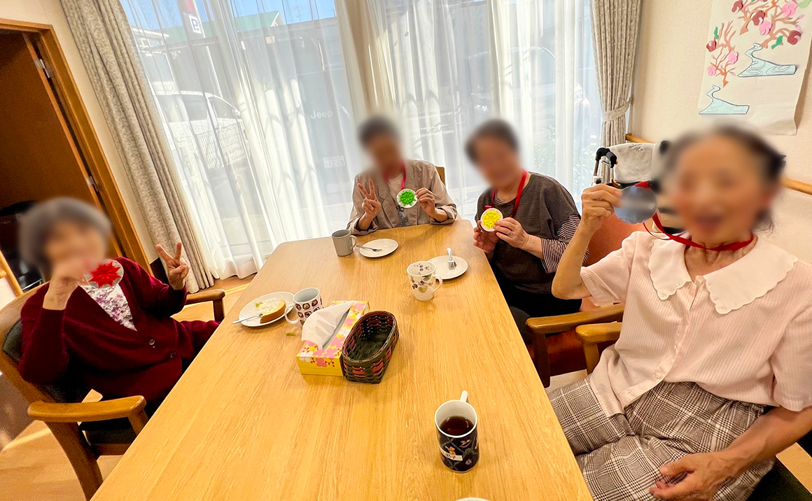 たのしい家戸田 パート1の続きです! 先ほど購入したケーキを「美味しいね~」と仰りながら、召し上がりました~🍰 また、敬老の日ということで、職員からご利用者様全員に手作りペンダントをプレゼント! 「これ作ったの!こんな上手に作れるなんてすごいわね~」と、とても喜んでくれました!