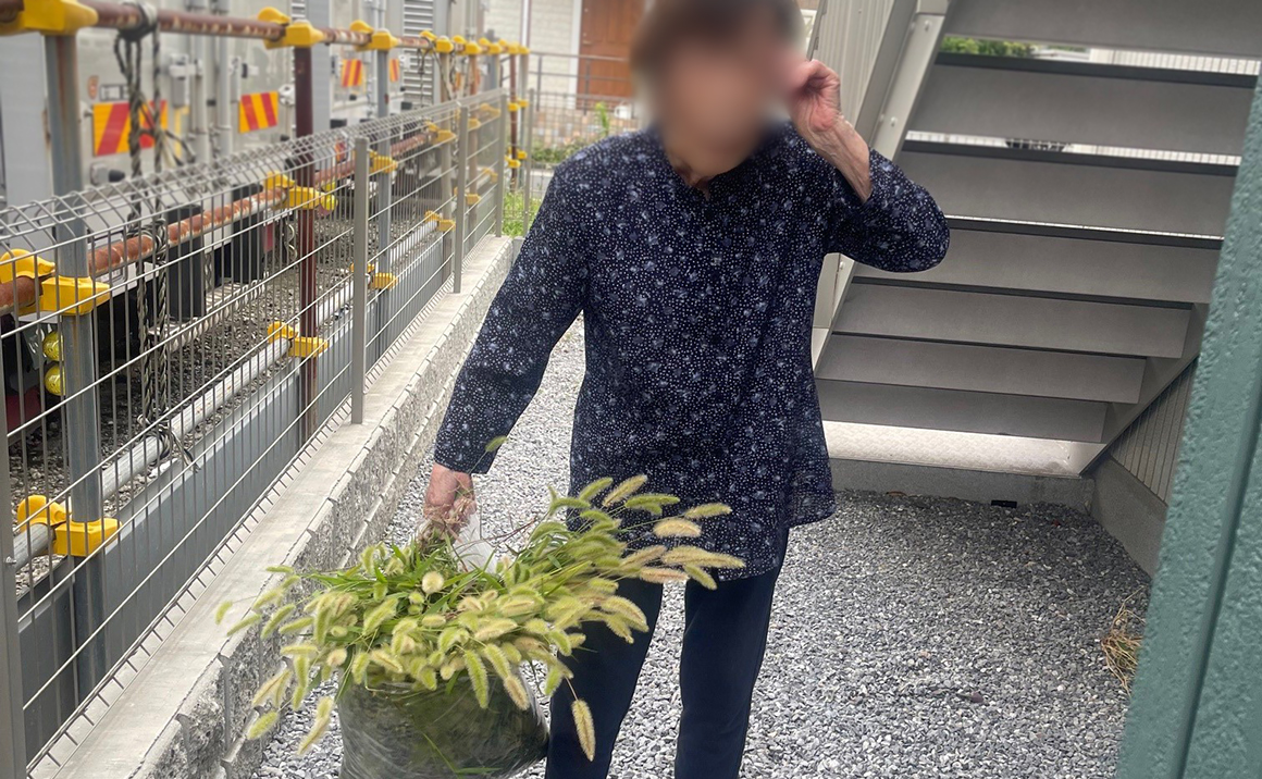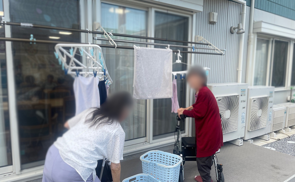 ご利用者様に洗濯物の取り込みや草むしりをして外で活動をしていただいています~
