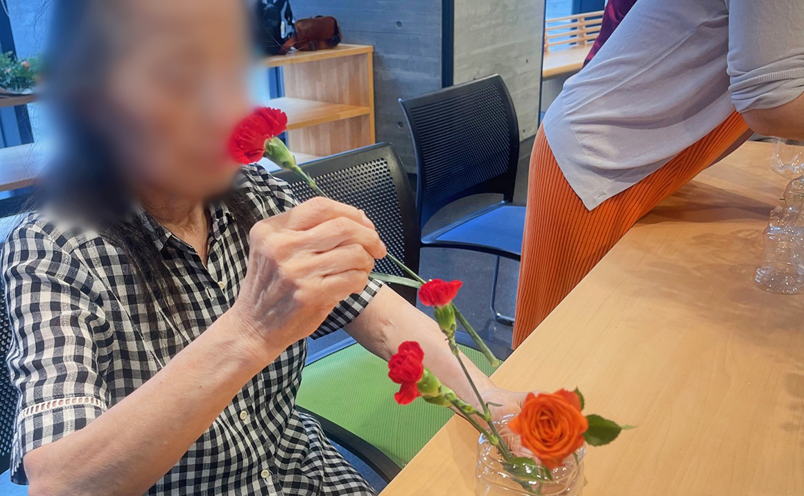 今回は、認知症のカラーであるオレンジ色のバラを使用して生け花を開始!