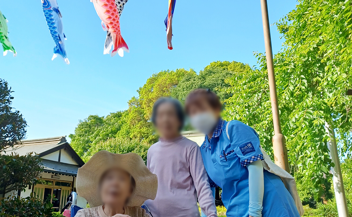 5月5日は端午の節句でした。 近くにある氷川神社や次大夫掘公園にはたくさんの鯉のぼりが泳いでいました。 天気のいい日に散歩がてら記念撮影です♪ 当日のお風呂は菖蒲湯にして、皆様の無病息災をお祈りいたしました。