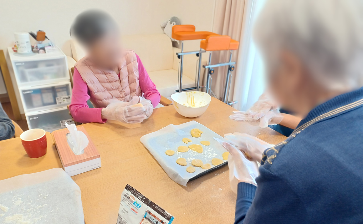 今回はたのしい家喜多見でのおやつレクの紹介です! 先月から介護等体験で来てくれている大学生の皆さんと一緒にクッキーを作りました。