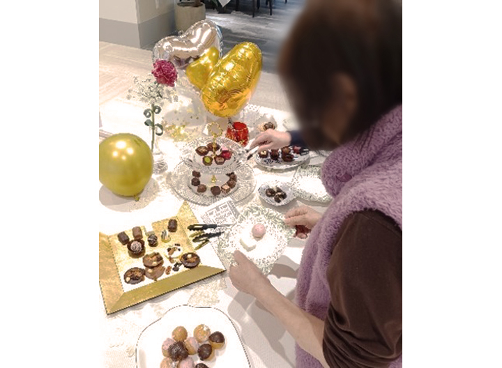 色々な国のチョコレートを集めたアフターヌーンティーの始まりです。 目を輝かせてチョコレートを選ばれる可愛らしい姿は乙女そのもの。 甘いものは心を和ませ話も弾み、職員も交えて沢山の話の花が咲いていました。