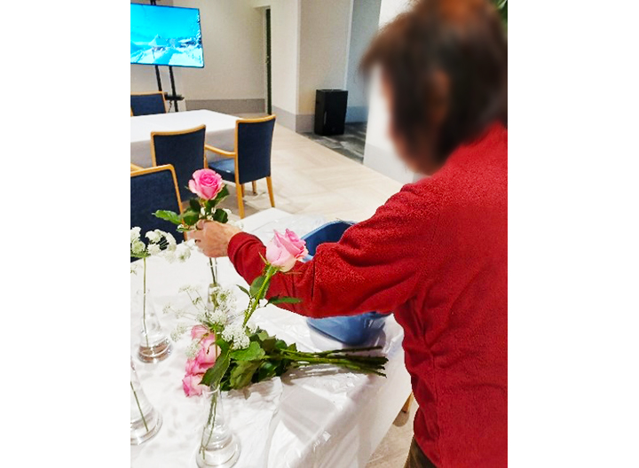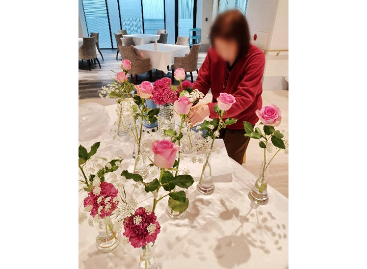 朝早く内覧会に色を添えてくれるキレイな花が届きました。 早速入居者様にお手伝いいただき、剪定されたバラと前回からまだまだ元気なカーネーションも一緒にレストランを彩ってくれています。