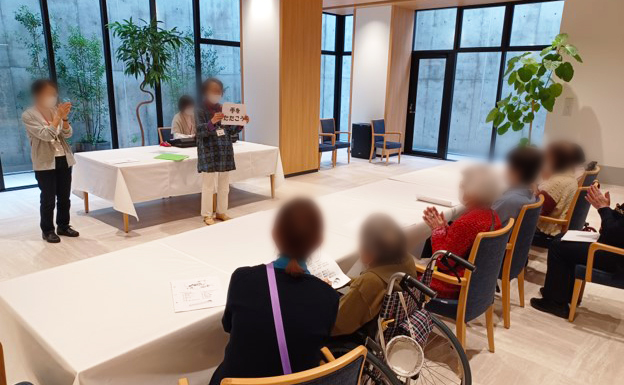ティータイム前に「どじょっこバンド」さんによる歌の会が行われました。 「春の小川」童謡や「瀬戸の花嫁」演歌、歌謡曲もあり参加された皆様も歌詞カードを見ながら一緒に歌われています。 中盤では歌に合わせて体を動かすこともあり、12曲もあると疲れるかと思いきや皆様アンコールを望まれるほど楽しんでいただけたようです。