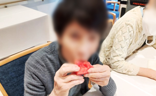 おやつのスイカを召し上がられながら神戸大学の学生さんが行うちんどん屋を鑑賞いただきました。
