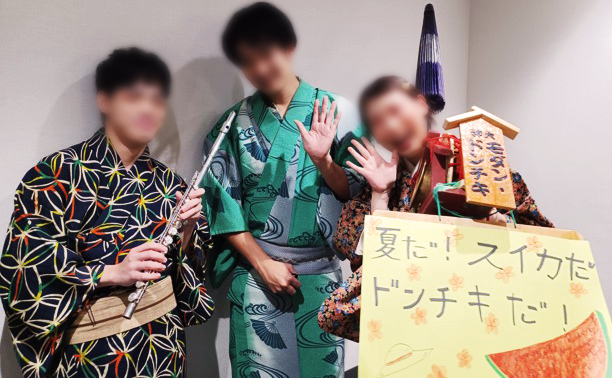 お盆が過ぎても変わらぬ暑さの疲れを振り払うようにスイカ割りでストレス発散し、神戸大学の学生さん達のモダン・ドンチキさんに来ていただきました。