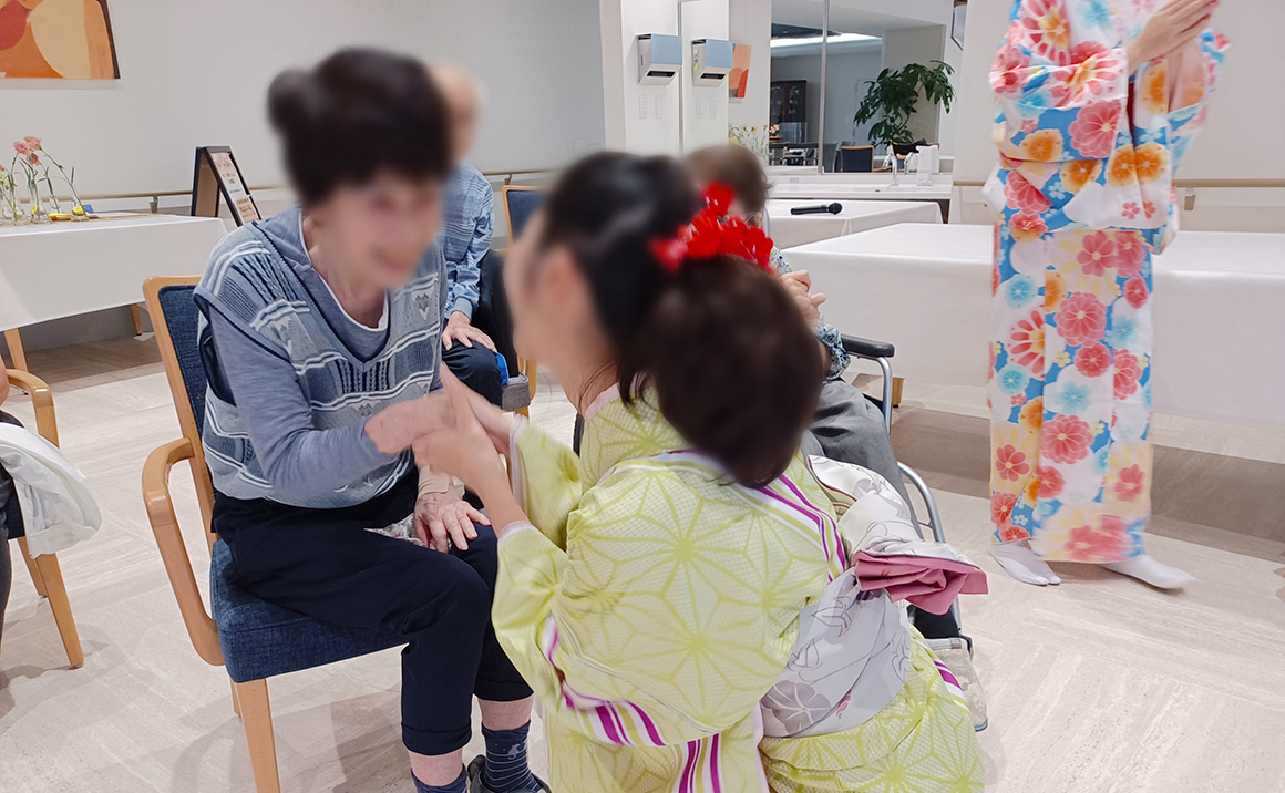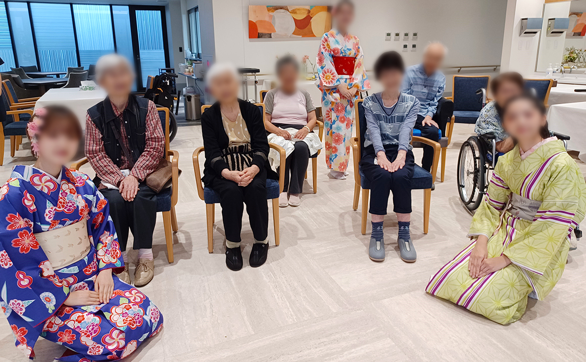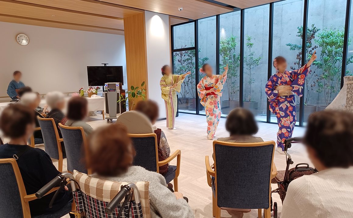 10月に入りいよいよ秋めいてまいりましたが、当施設の初めての秋イベントは「日本舞踊」です。 はまいしや撫子さんの三人娘が緊張の面持ちで音楽に合わせ一生懸命踊る姿に皆様もお孫さんを見守るような温かい雰囲気で始まりました。 一人一人の踊りでは「花くらべ」は皆様も知っている曲だったようで自然と体が動く方もおられ、指先まで意識した可愛らしい動きに見入ってしまうほどです。 あっという間の時間でしたが記念撮影では握手をされる方もおられ素敵な写真になりました。