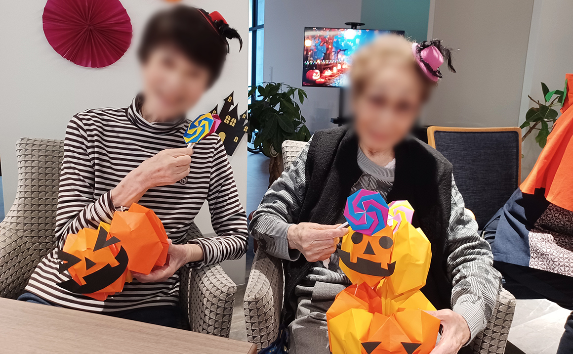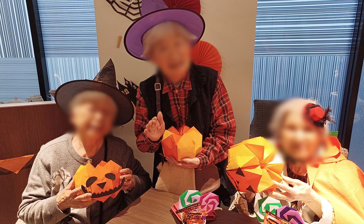 今月初旬に皆様にお手伝いいただき、折り紙等で作成したハロウィン仕様の飾りもカフェエリアの照明との相性良く、ハロウィンの雰囲気を感じていただけたようです。