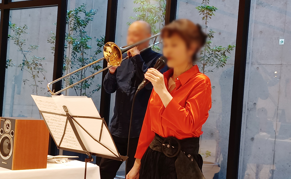 風に舞う木の葉に秋の深まりを感じる11月。 本日はトロンボーンとピアノを使用したジャズを皆様に楽しんでいただきました。 映画で使用された曲や皆様が昔聞かれた曲など英語の歌詞ではありましたが足でリズムをとり、 目を閉じ口ずさみその世界へ入り込まれていました。 楽譜も用意し皆様一緒に歌っていただく際もレストランに響くキレイな音色に歌手の方が「教会のようにキレイな声ですね」とお褒めの言葉もいただいています。