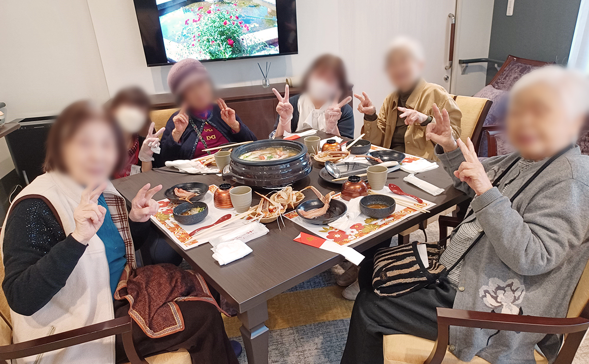 「かにしゃぶなんて久しぶりね」と皆様大きなカニの身を見て笑顔がこぼれ、