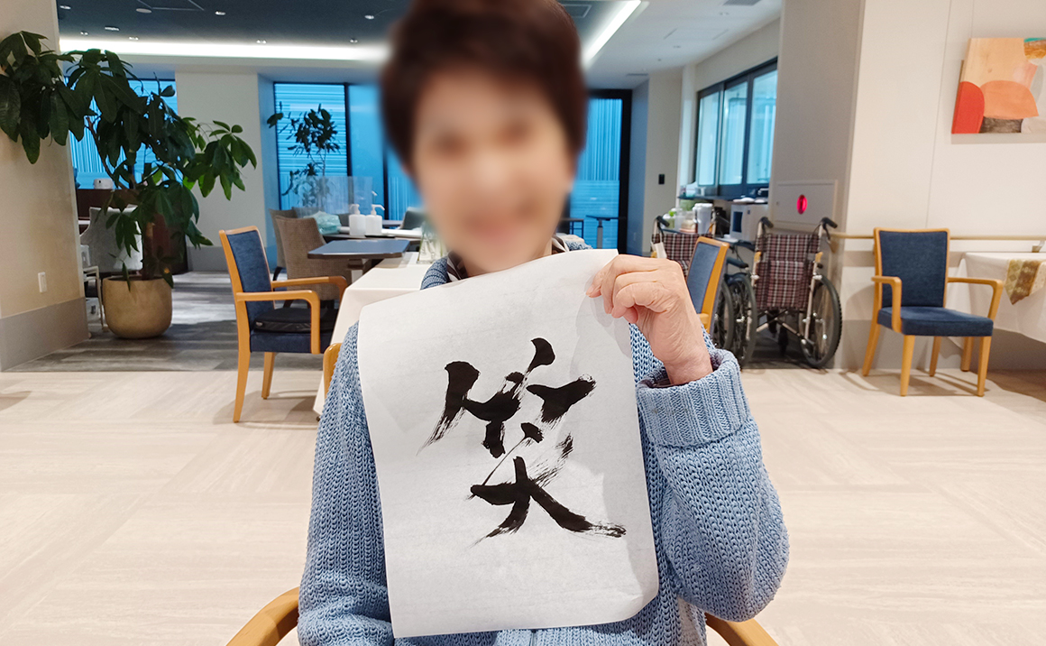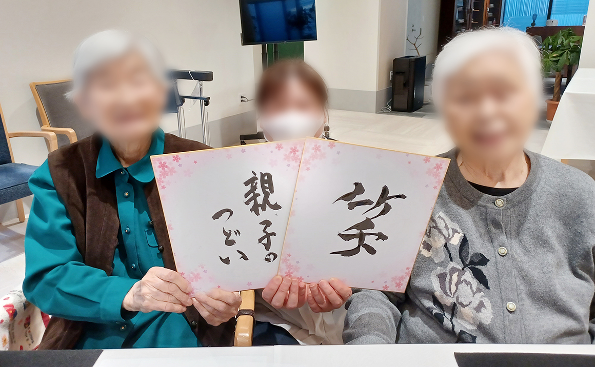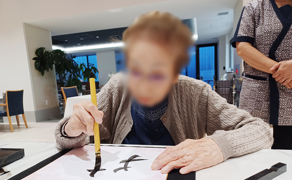 年も改まり、決意を筆にこめ書初めを行いました。 今回のお題は「好きな言葉」です。 「うまく書けないわ」と納得がいくまで同じ字を書かれる方や「紙ください」と次々と言葉が溢れる方など、皆様の思いが伝わる時間になり、 最後は色紙に一番好きな言葉を書いていただきましたが本番というのもあり緊張の面持ちで筆を運ばれていました。 お部屋に飾ってある色紙を見て家族様と書道の話で盛り上がっておられました。