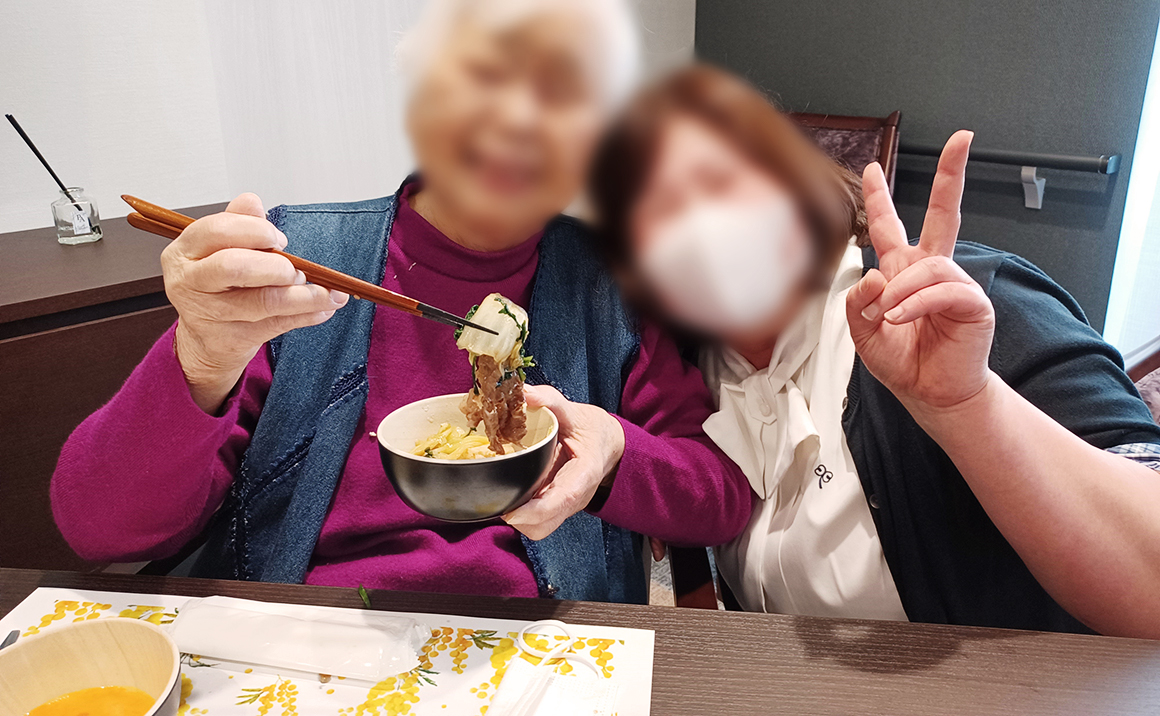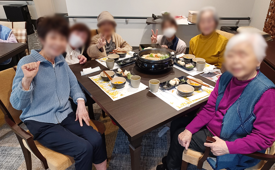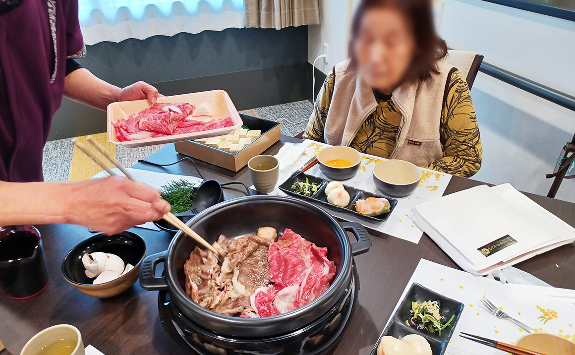 プレザングラン岡本で二回目のすき焼きパーティーを開催しました。 今回は神戸牛だけを扱っている精肉店でお肉を準備し、皆様にすき焼きを楽しんでいただきました。 精肉店の方から美味しいお肉の食べ方を教えていただき、一枚目のお肉は焼きしゃぶで召し上がっていただきました。 「すごくいい香り!」「贅沢だわ~」と皆様目の前で焼かれるお肉に目を輝かせておられました。 二種類のお肉で食べ比べを楽しまれ、「こんなにたくさん食べれるかしら」と話されるもお箸はとまらず 締めのうどんまでしっかり堪能されました。